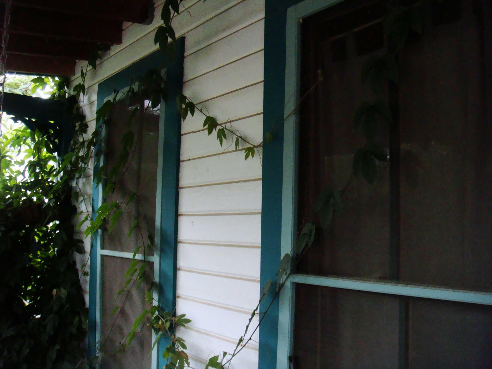 My front porch has been consumed and I mean consumed by this Passiflora Coccinea or Red Passion Flower this year. The vine escaped its usual winter die-back fate last year due to the particularly mild winter we had. This years growth on top of the old growth has created a vine of monsterous proportions, it is attempting to engulf my entire front porch. If we do not have a cold winter this year I fear my front door may become unusable.