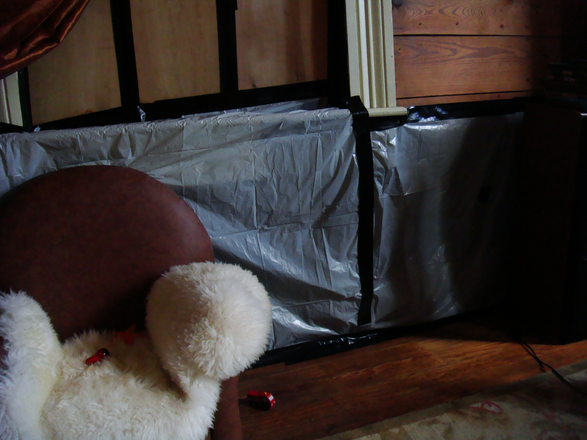 Staying on the subject of rather large vehicles, driving at high speed into the sides of houses, this is the current scene in our living room right now. The recent cold fronts we have been experiencing have created the need for some creative improvisation, oh yes when the colder wind picked up recently it was whistling through here. It made watching a movie feel more like an outdoor retreat. What was our creative improvisation? Well as you can see, it involved copious amounts of Duct Tape and some plastic leaf bags to achieve this deconstructionist aesthetic. I have to mention that these bags are constantly sucking in and blowing out, it is like living inside of bellows. The Botox Lady had a really strange look on her face when I walked past her from the shed carrying the roll of Duct Tape.