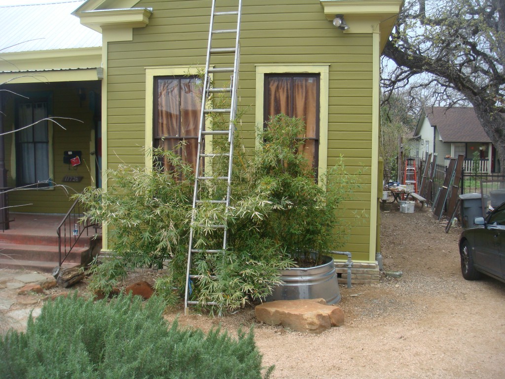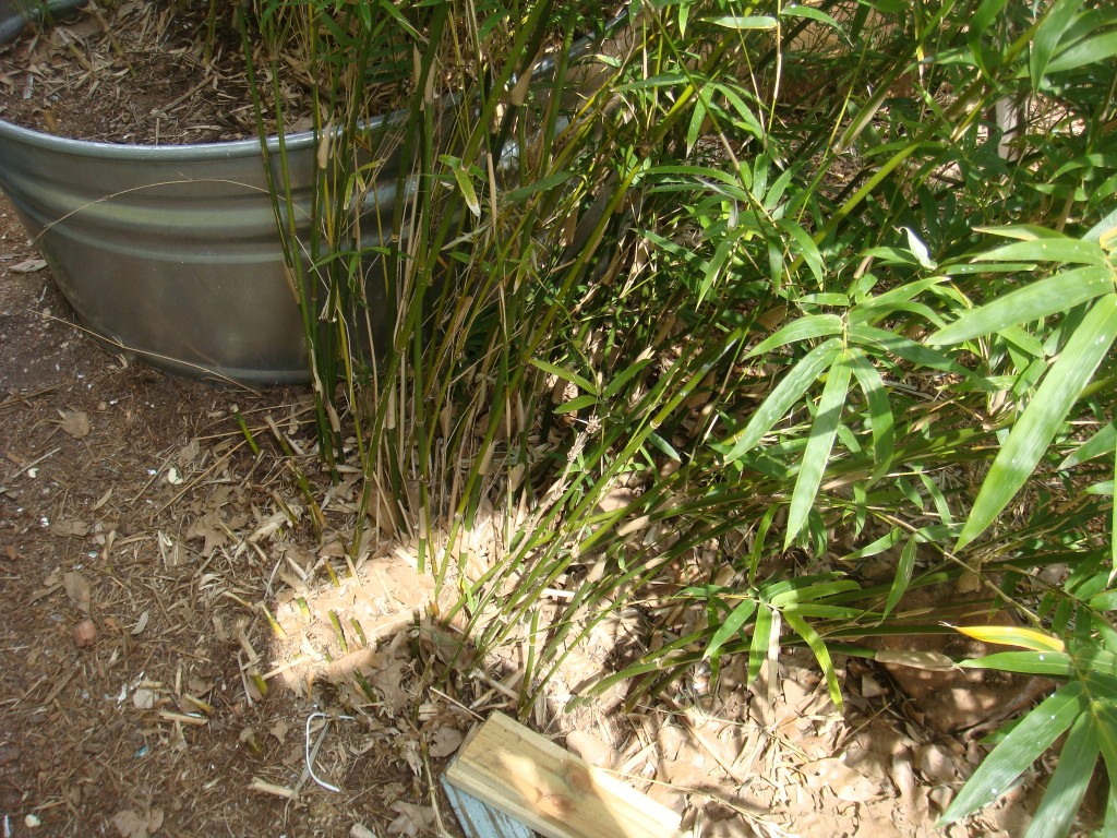 The scale of this Mexican weeping bamboo and the stock-tanked golden bamboo where the Tahoe hit has disturbed me for quite some time. The plants are just too tall in front of the house, what had been my thought process here? A momentary loss of sanity? Anyway, my primal Advil taking instinct told me this was going to be one tough dig! The one-ton rock you can see in front of the feeder tank has not moved since it fell off the back of the wagon that delivered my last six yards of decomposed granite, six months ago.