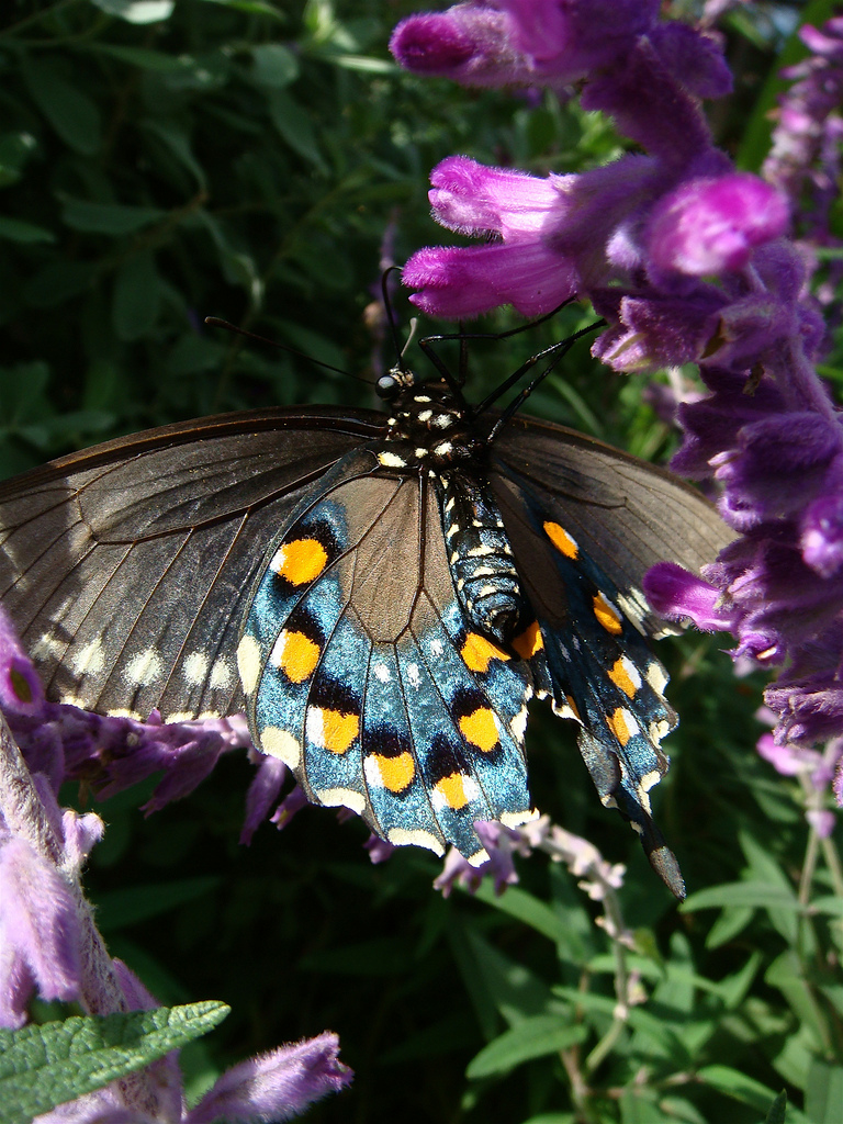 Pipevine Swallowtail adults are black and the males have an amazing electroluminescent blue sheen to their hind wings. Females sometimes have a hint of the blue but are mostly black. The undersides of the hind wings are decorated with white and orange spots. When they feed, Pipevine Swallowtails rarely stop fluttering, making it hard to get a good look at them, and a decent picture.