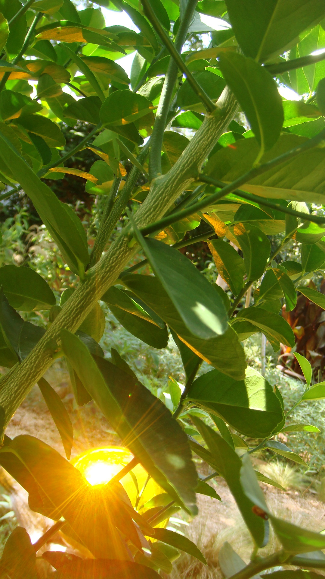 The returning and reflected sun hit this gazing ball perfectly, illuminating the underside of the leaves of my Mexican lime tree that has made a pretty decent return after I cut it back to the ground after last winter’s freezes.