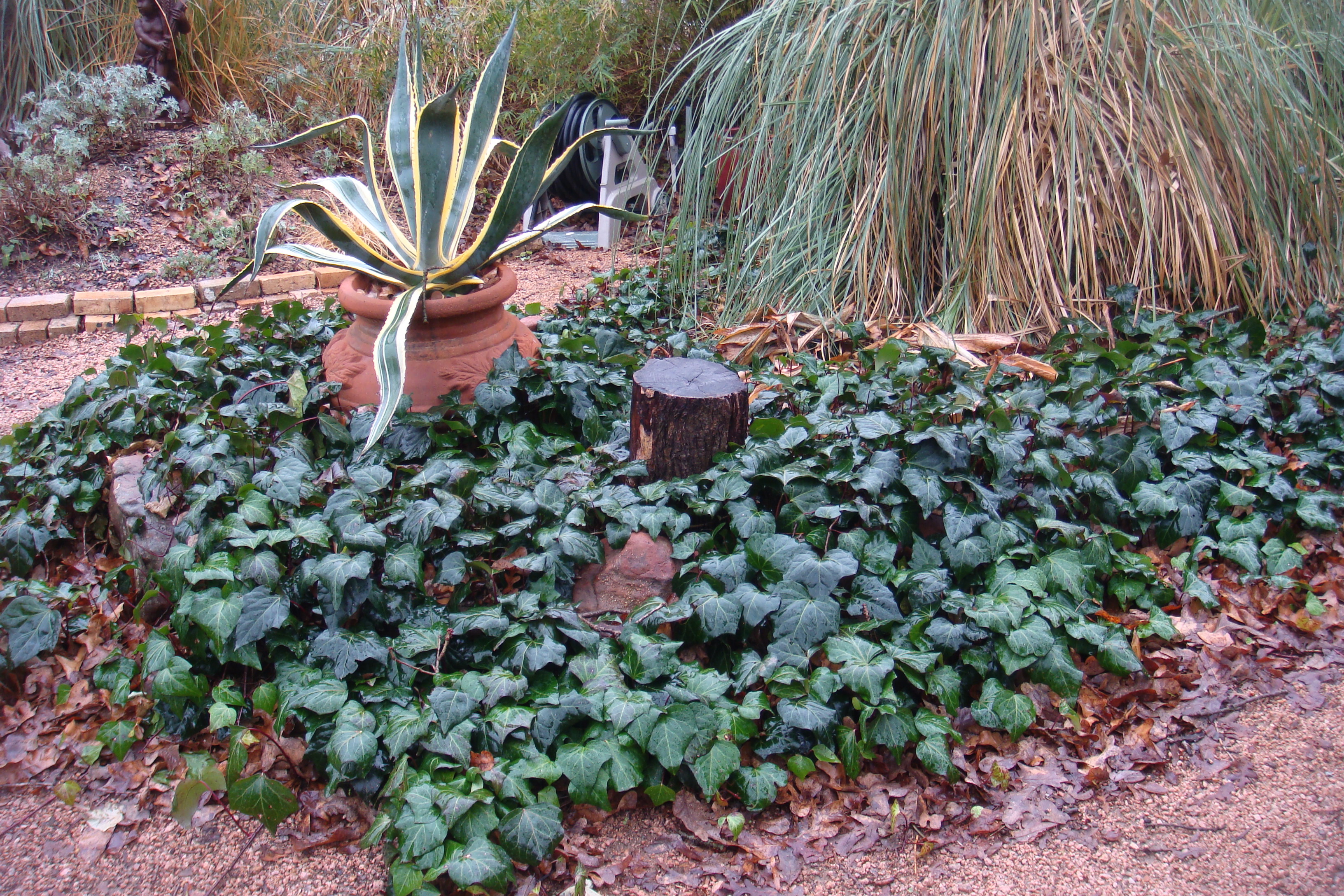 or Persian ivy is threatening to consume one of my decomposed granite pathways, a good looking plant in the winter rains. I am not sure what is going on with that draping agave americana? Or is it a large crustacean?