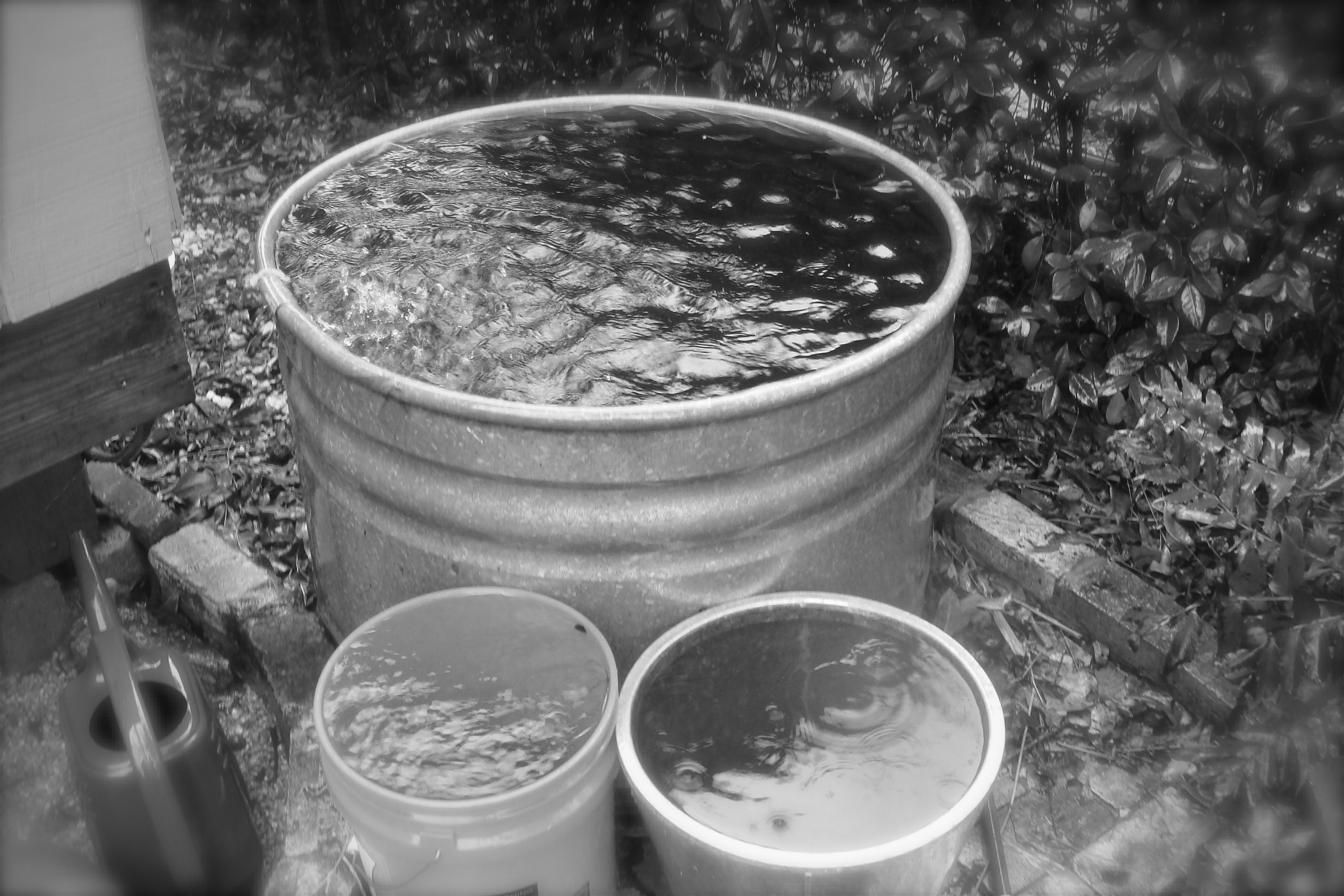 My “everything but the kitchen sink” rainwater collection “system” is fully replenished once again…