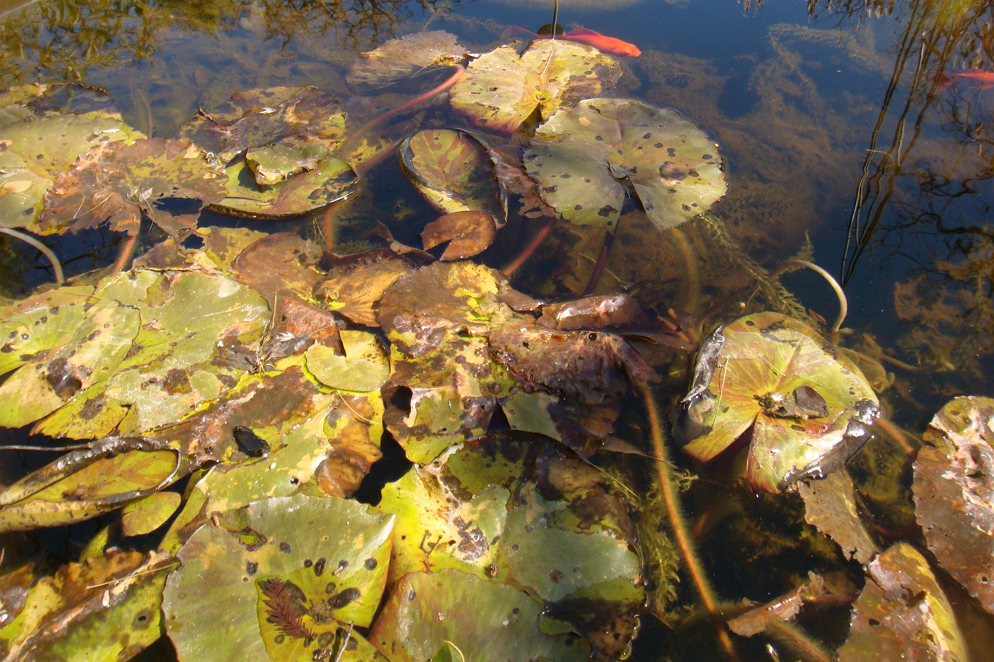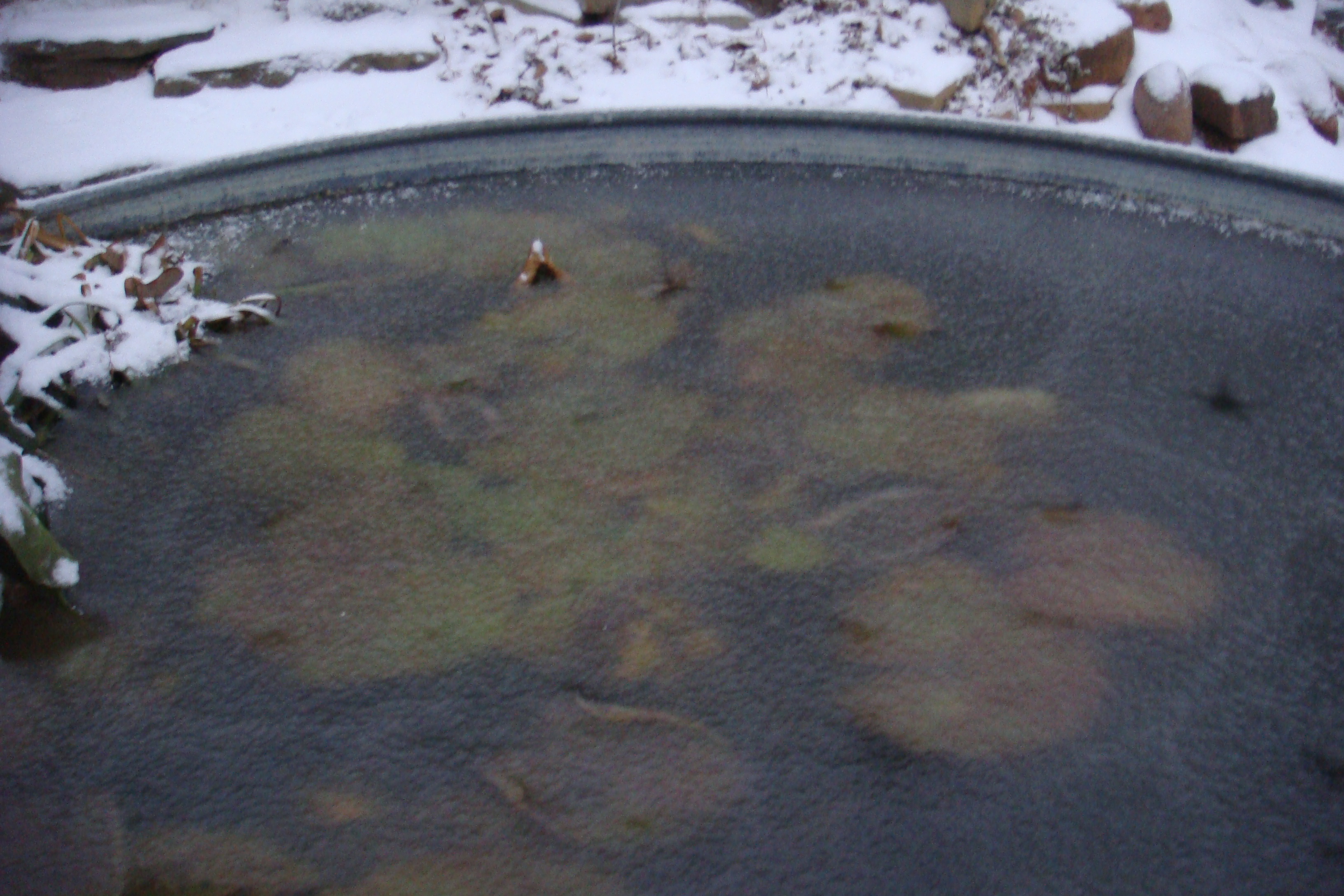 These are my tropical Madame Ganna Walska water lilies, submersed under a rather thick layer of ice, not their preferred habitat of choice.