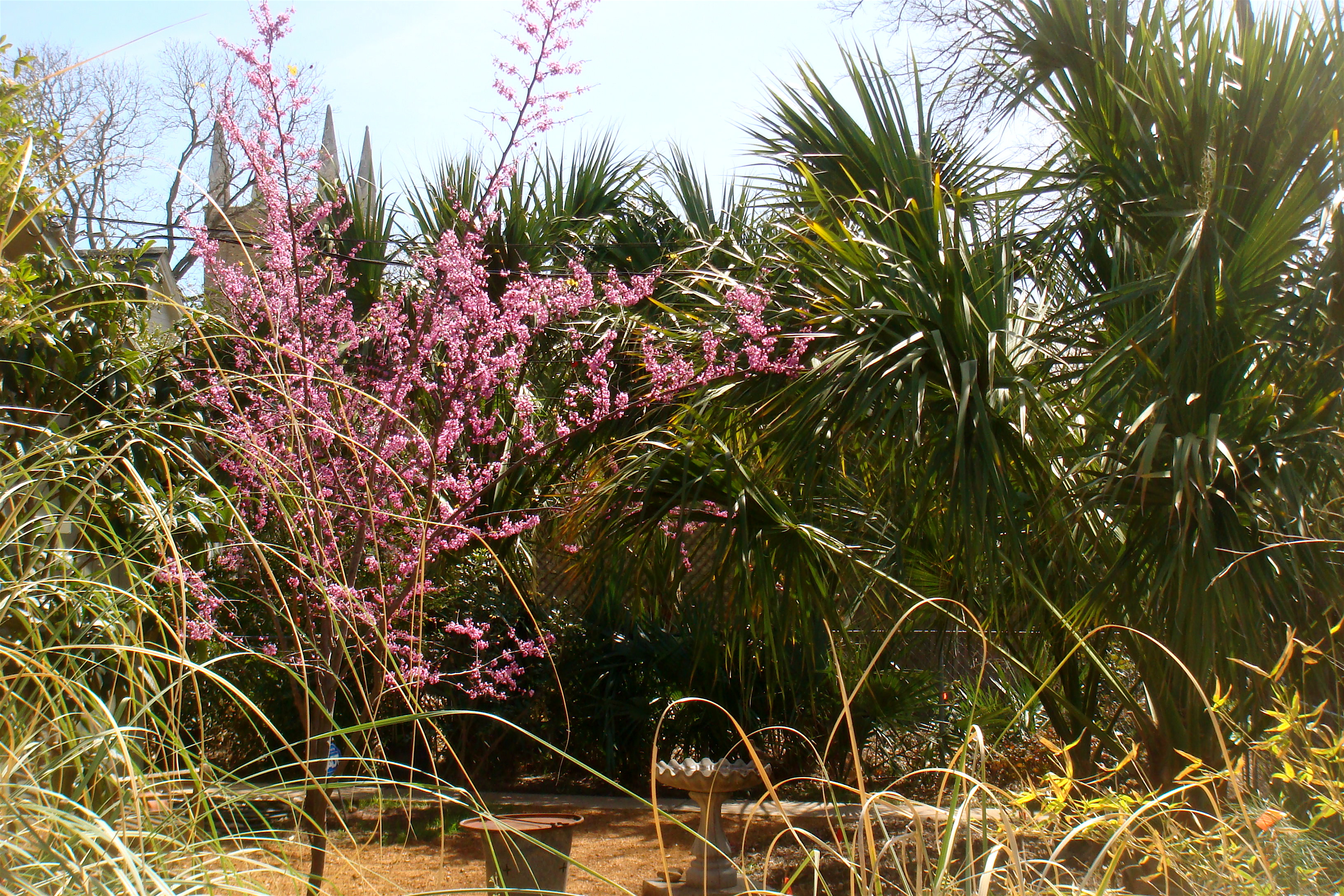 One of the ESP’s “borrowed’ scenes. I love the way the Texas red bud looks set against the contrasting foliage of Texas sabal major (with an understory planting of Texas sabal minor to continue the foliage theme all the way down to ground level) – a very tropical planting scheme, and one that is totally frost-proof. The pink emerging blooms of the red bud are punched out set against this dark olive backdrop.