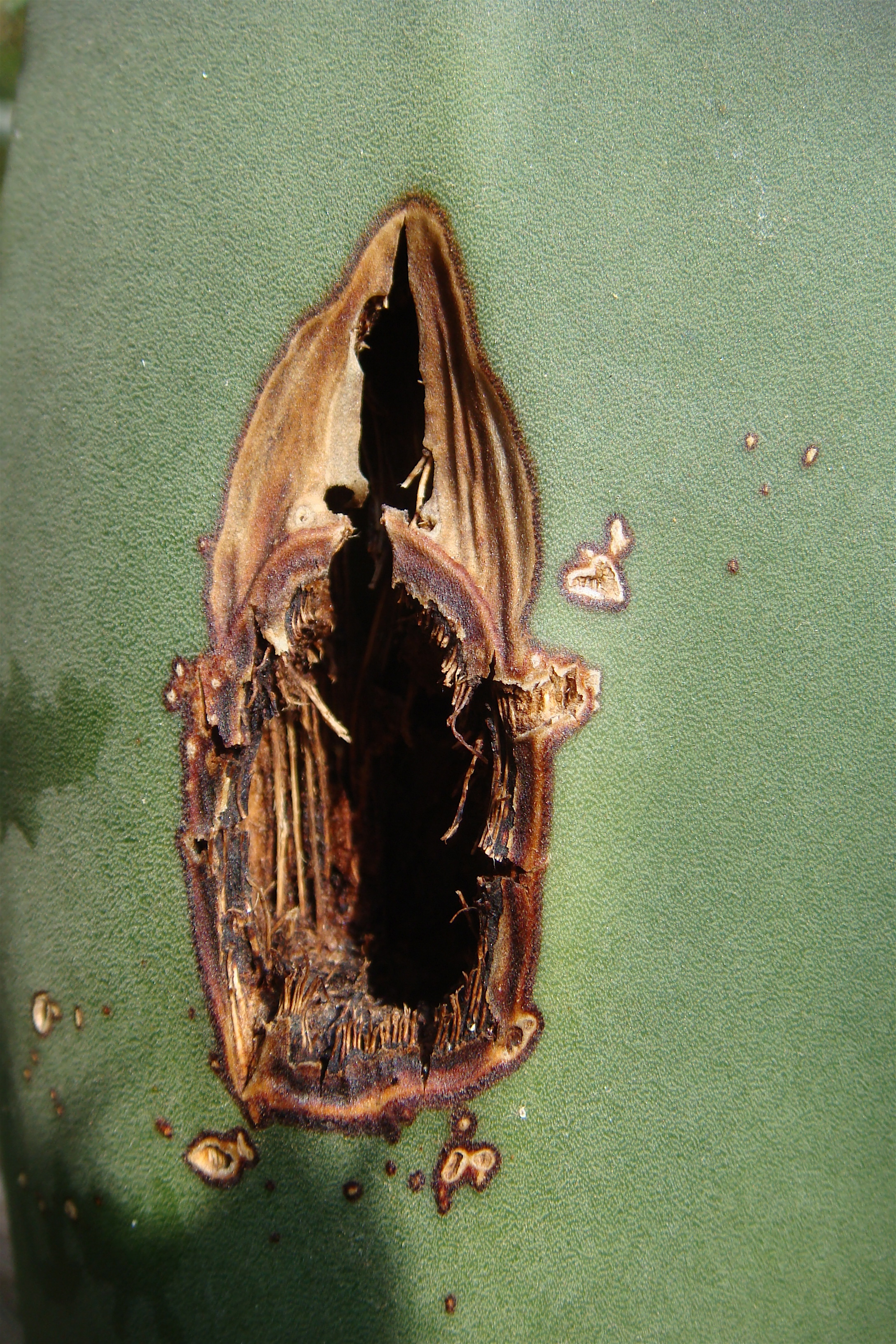 What started as small brown scratch marks last year, has turned into ominous black holes and now dark cavernous pits. This borer has gone to the center of the plant and the terminal damage has already been inflicted.