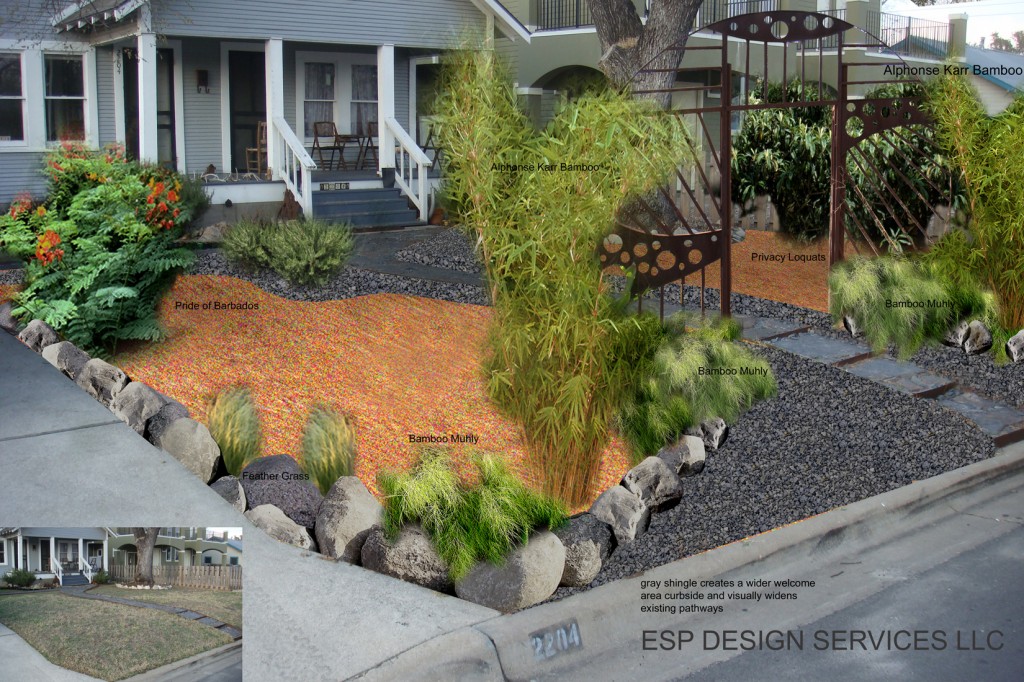 My goal here was to create loose privacy looking from the house to the street and to open up the entryway into the property to make it more inviting. The small existing pathway was visually widened by using gray shingle which complements the color scheme of the house, breaking up the linear pathways. Boulders were also chosen for their complimentary gray color with softening plant selections to integrate the gate and hardscaping. If you are thinking you have seen that gate before you are of course correct…it is the same as the one in the Patch, a prop from the “Spy Kids” movie. These are the great folks that gave me it!