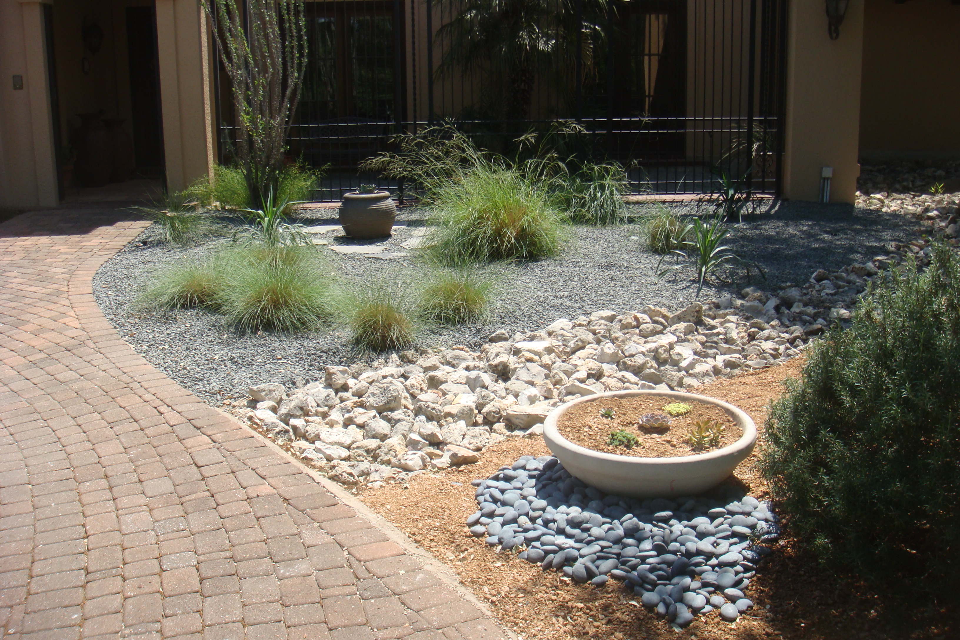 The fenced in courtyard has a magnificent Mediterranean fan palm growing in it, one of the largest I have seen…so you can grow them in Austin! The before image (left) was a rather random affair, lots of mediums doing visual battle with each other, and seemingly haphazard plantings of ornamental grasses in a bed of turfallo grass that was weak and full of weeds. The visualization on the right adds a bit of punch to the scene. I decided to replace the grass with Tejas black shingle to deepen the contrast and to reference the color of the wrought iron work on the enclosed patio. The focal point at this stage was a proposed bubble fountain that later became a planter. I went for a stand of soft leaf yucca to contrast the grasses that remained.