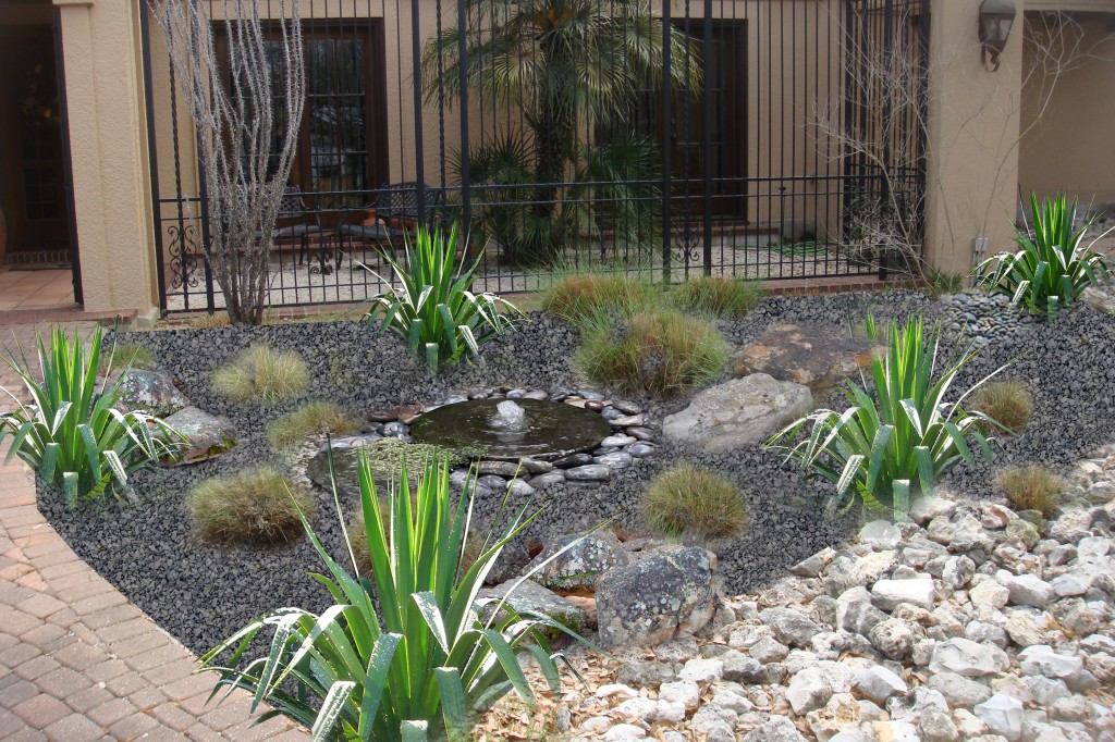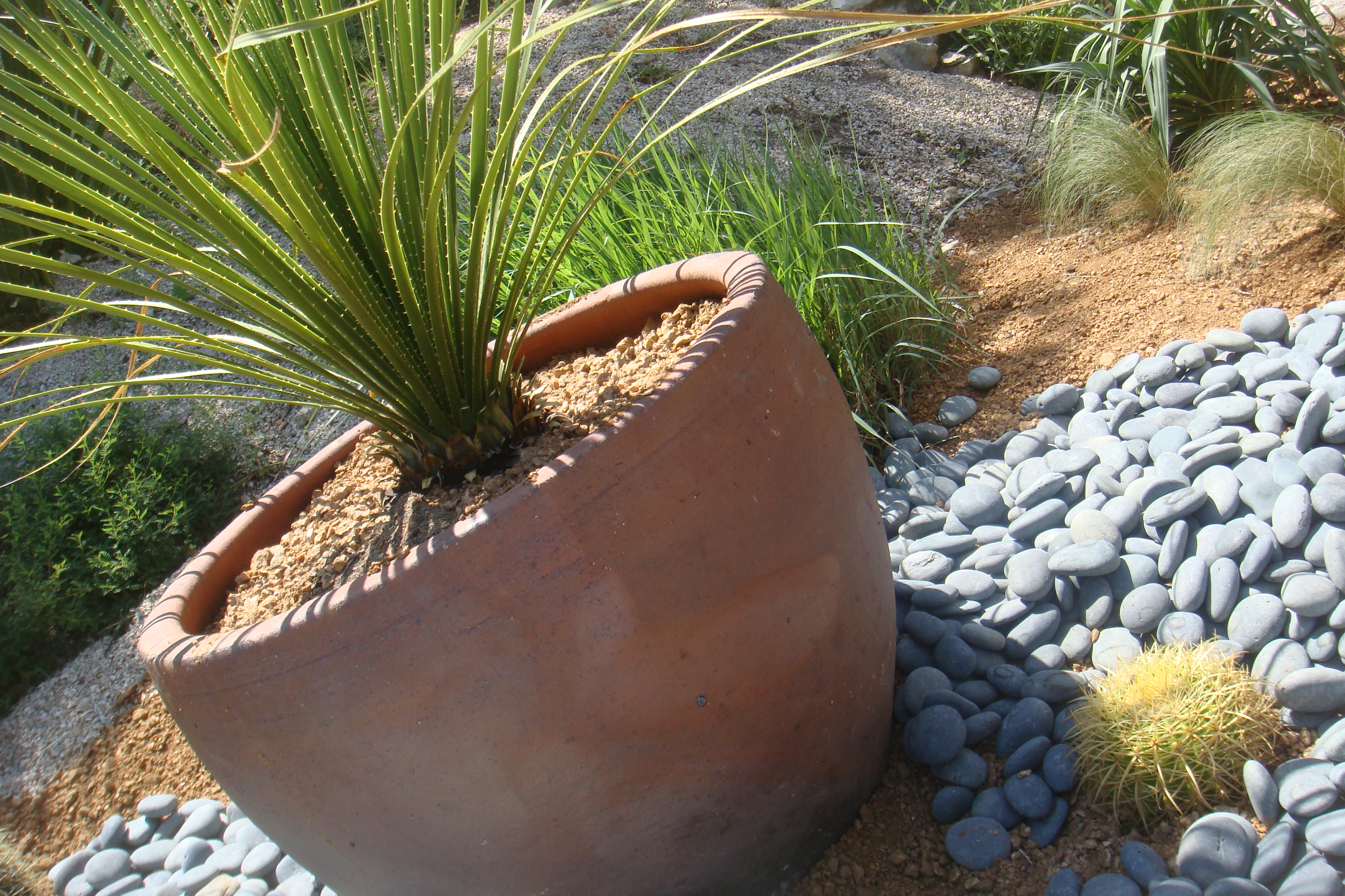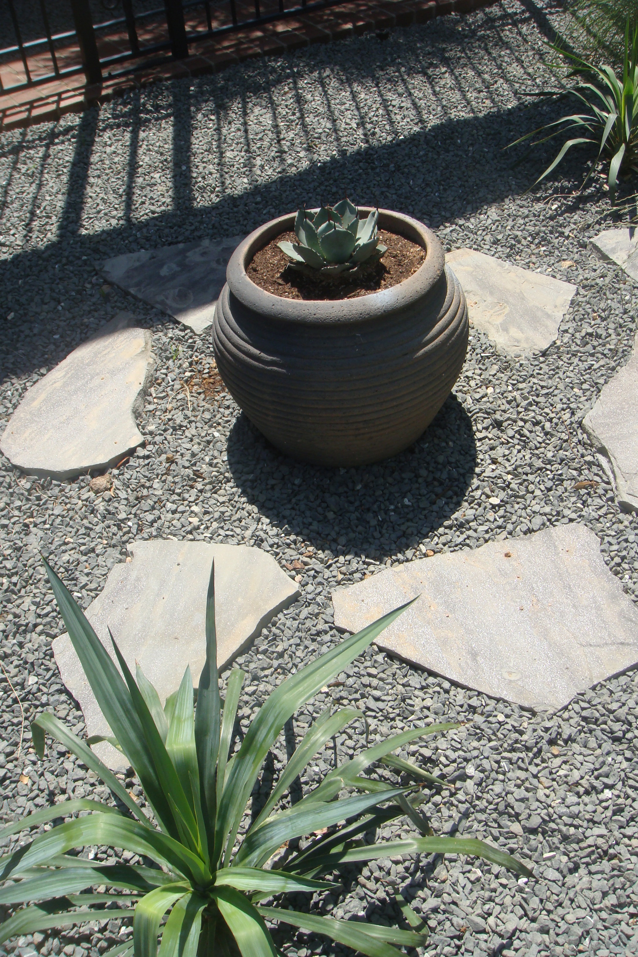 Here is the final result: The planter is populated by a baby Agave parryi huachucensis and is surrounded by accenting grey flagstone.