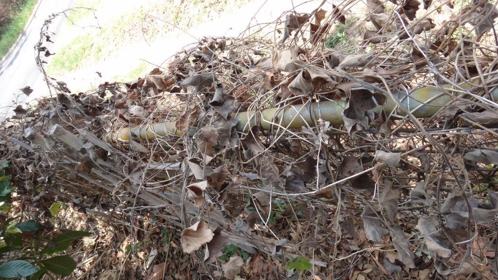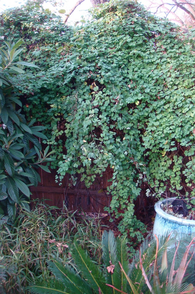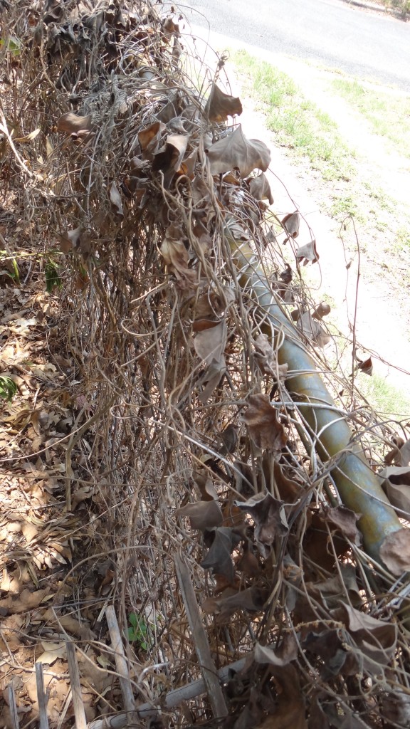 War has finally been waged down my back fence line against this potent cocktail of frog and weed vines that have been developing and self-seeding for, oh I would say at least twenty or thirty years. Oh yes, these are not going away without a fight, or overnight. It could conceivably take a couple of years to finally eradicate it all. My neighbor has been hitting these hard from the alley and I keep swabbing them with copious amounts of super concentrated Round Up from my side. It looks like a war-zone.
