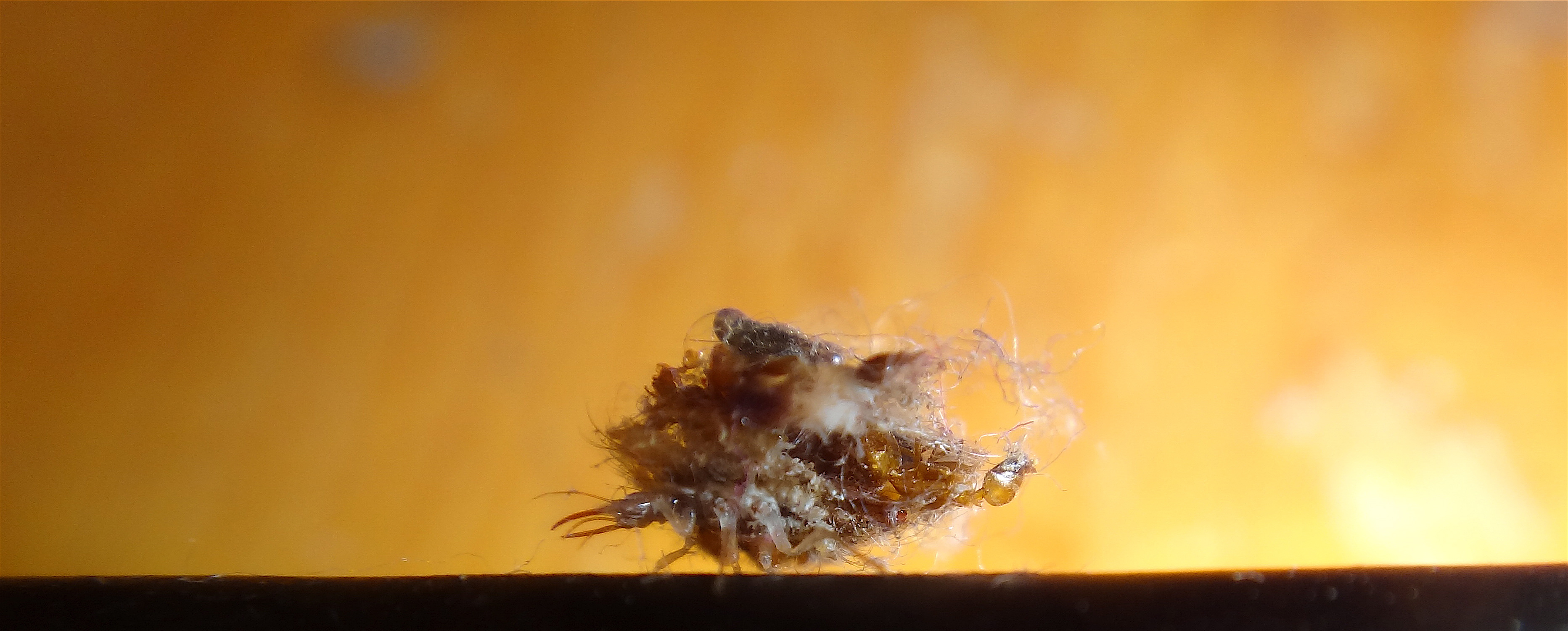 I believe the following image is the larvae pushing around its cart full of trash down one of my computer cables. I can definitely see some of our living room rug woven into the structure and is that part of a gummy bear?…Very bizarre.