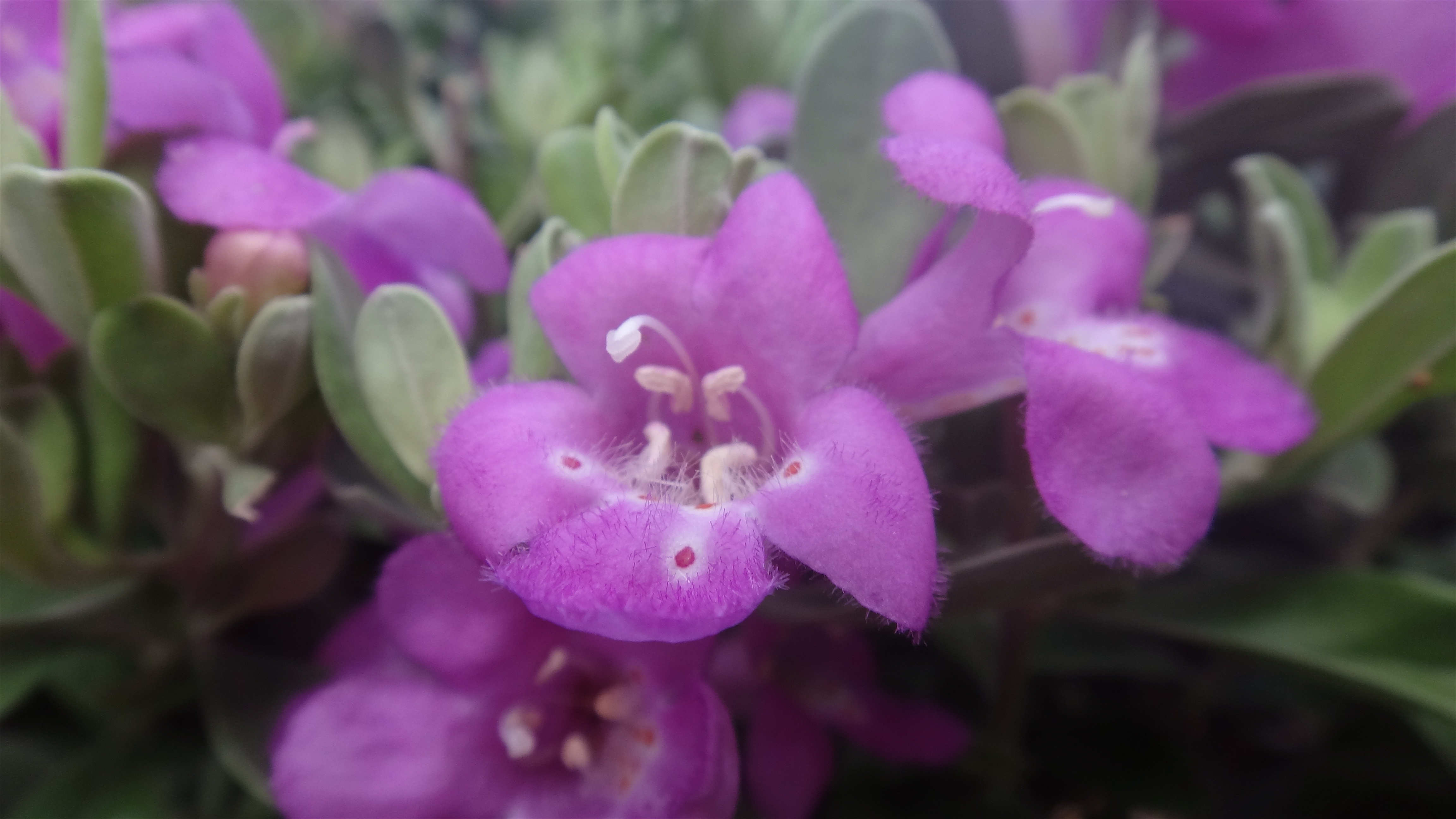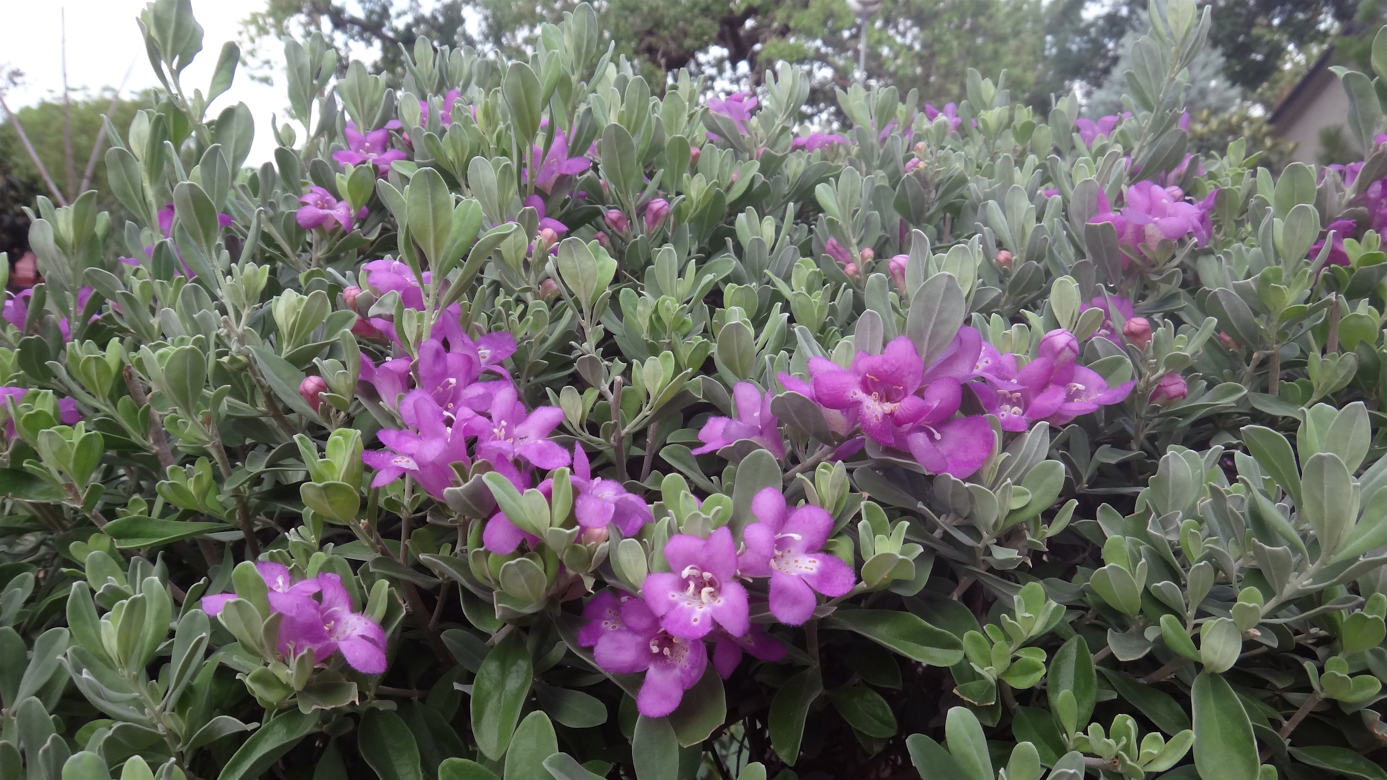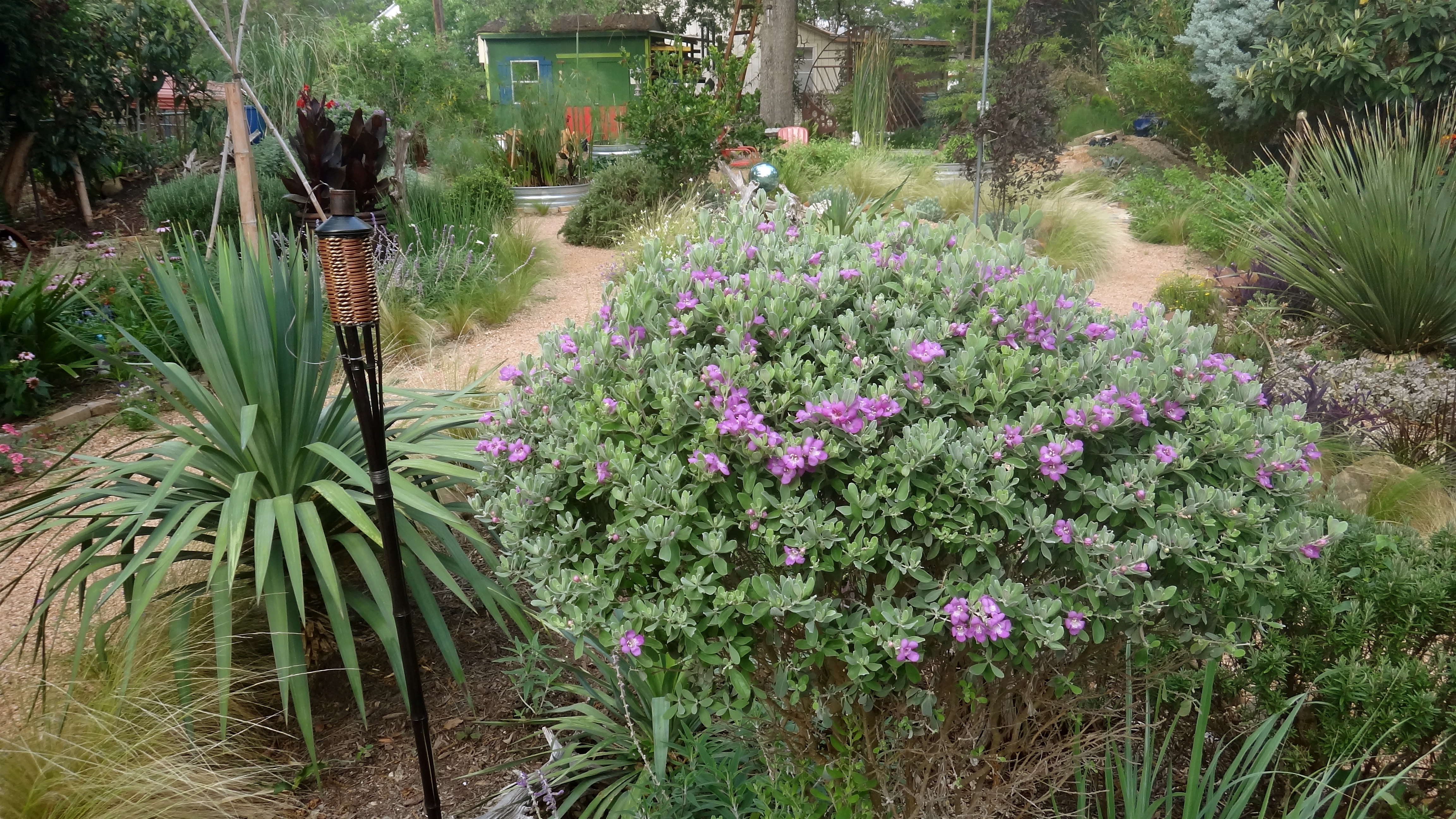 also called purple sage, texas ranger, silverleaf, white sage, ash bush and sensia. Purple sage comes from shrublands on limestone slopes in the Chihuahuan Desert of Texas, New Mexico, and northern Mexico. This is one tough plant, it can face droughts, freezes, high winds, salt spray, hungry deer, and blazing heat and keep right on performing beautifully. It can also apparently make for a good container plant, though I have no personal experience with it in this capacity…do you?