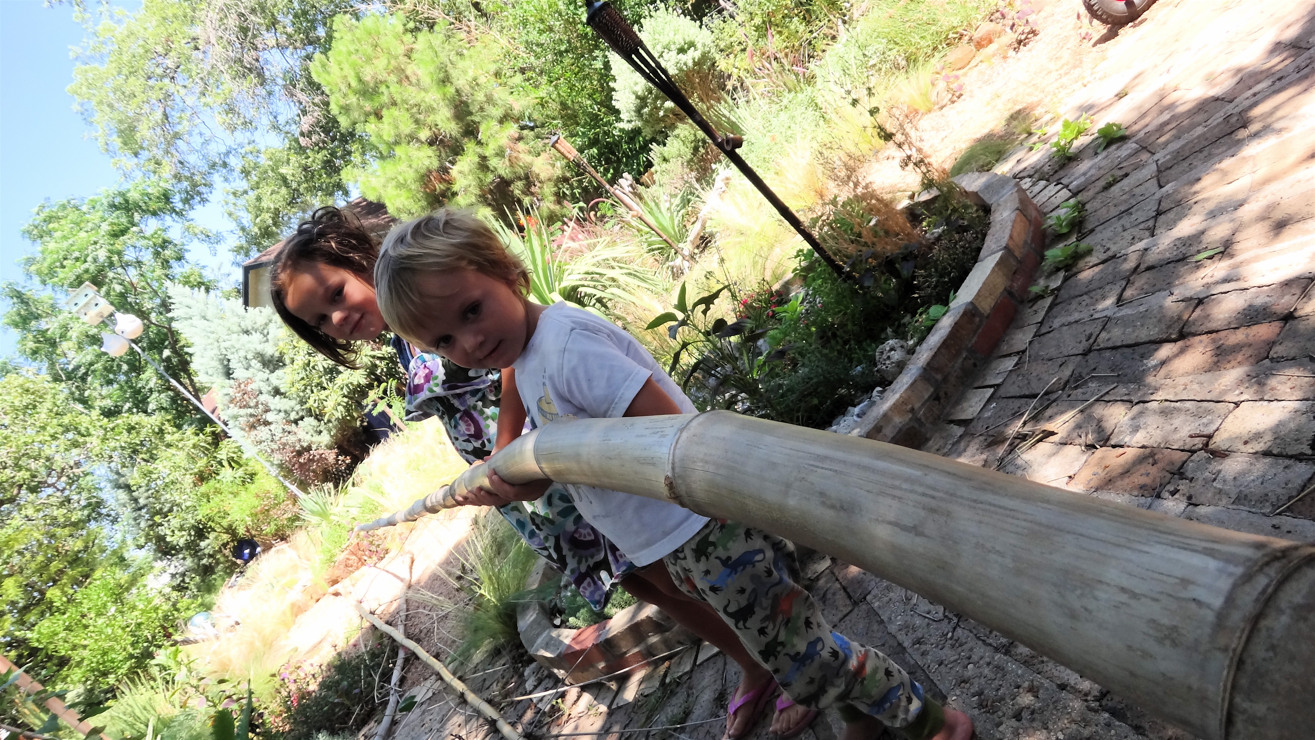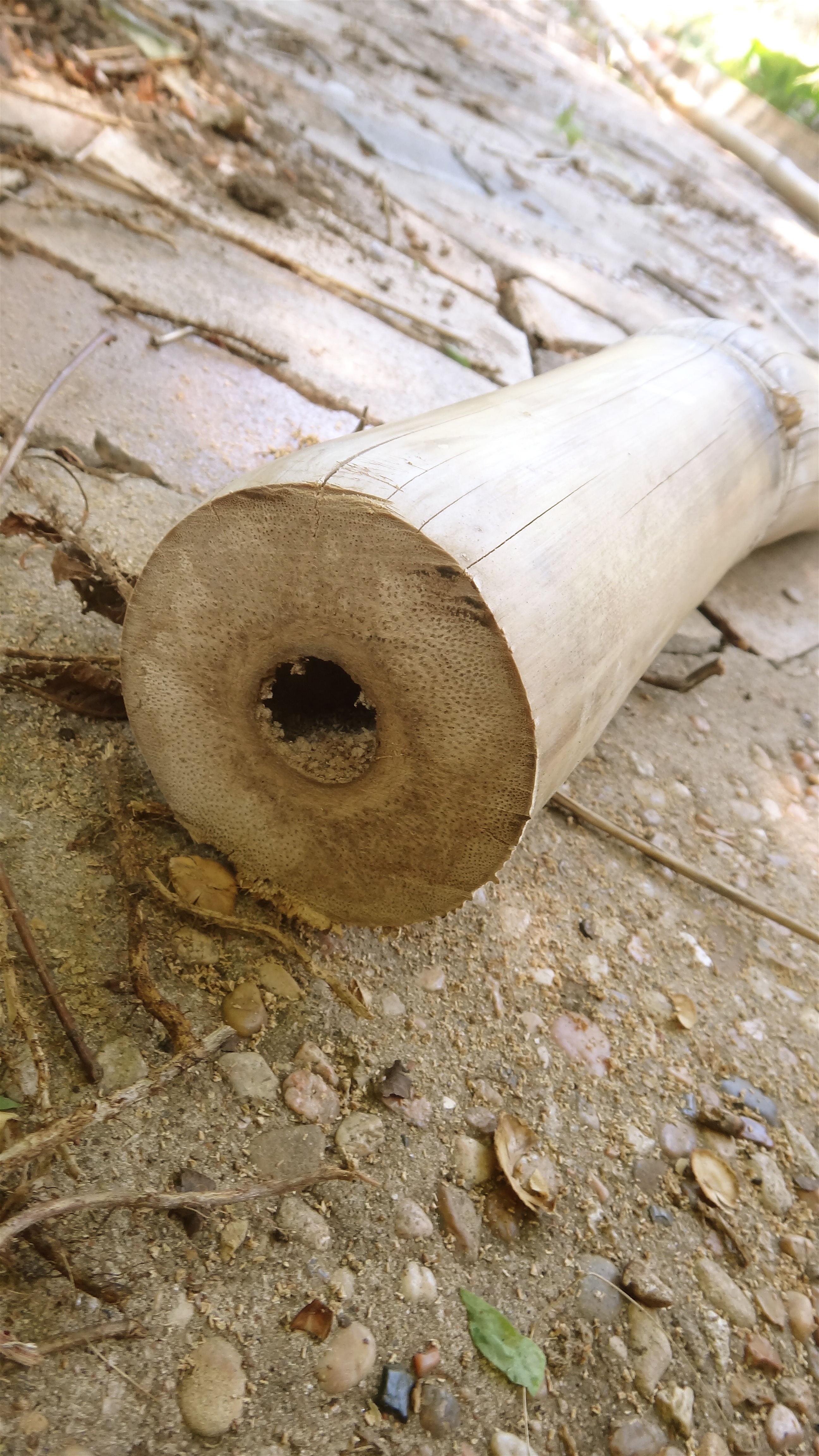 It has dried out these dead giant timber culms enough that when I pulled on one the other day It surprisingly moved a little at the base. This could not be a good thing, massive culms teetering over my neighbors house. Oh no, these needed to come down immediately. The bamboo roots had completely rotted and with a sharp twist they came away easily at the base, no saws or machete hacking required! I was feeling quite proud of myself until I realized that I was now wielding a forty foot spear.