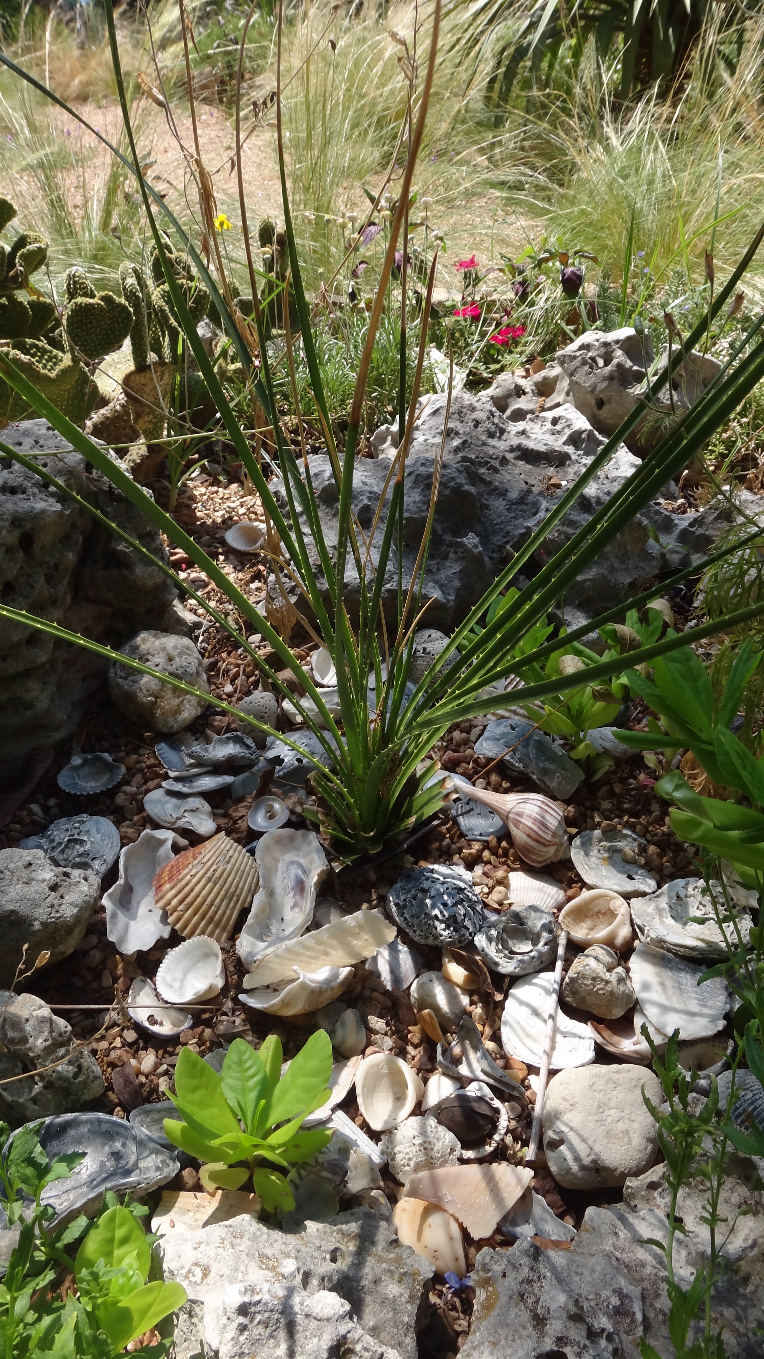 Our vacation shells have all been poured out around these baby jewels of Opar and this juvenile pinwheel sotol, the shells are a welcome reminder of our cooler and relaxing days spent at the beach. My brief holiday reprieve was immediately tempered on my return with an immediate 100+ degree jolt back into garden install reality. With my iced turban tying skills apparently lacking finesse (lack of practice), I have been forced to adapt to our current heated Texas temperatures the hard way…with a wayward turban combined with some plain old-fashioned hard work in the sun.