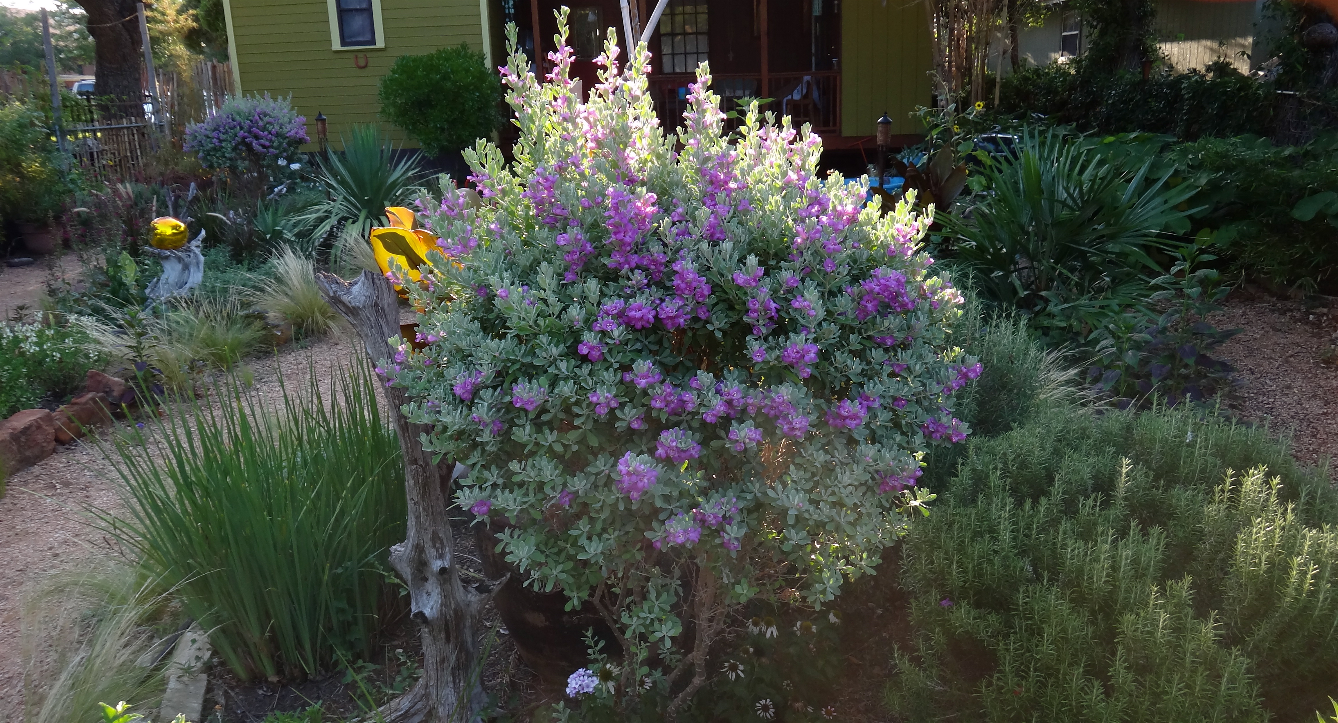 Love that sotol!!! Is the purple fountaingrass perennial for you? Can I ask why you hard prune your Cenizo now (or after it blooms)? Just curious. Do you ever hard prune it in later winter? I’ve never grown one. And last question…what is the purpose of the dillo dirt tank…as opposed to just water? Again, I have an inquiring mind. I’d be eeewwwwing on the spewing, too!!