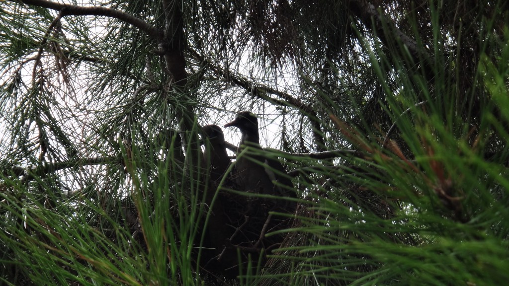 This family of doves perched in their “nest” on my Afghan pine, look totally ridiculous. These birds are not noteworthy for their engineering prowess when it comes to the art of nest-building. Oh no, in fact they appear to be totally rubbish at it, but they seem happy huddled together on their teetering platform. The whole scene is very: