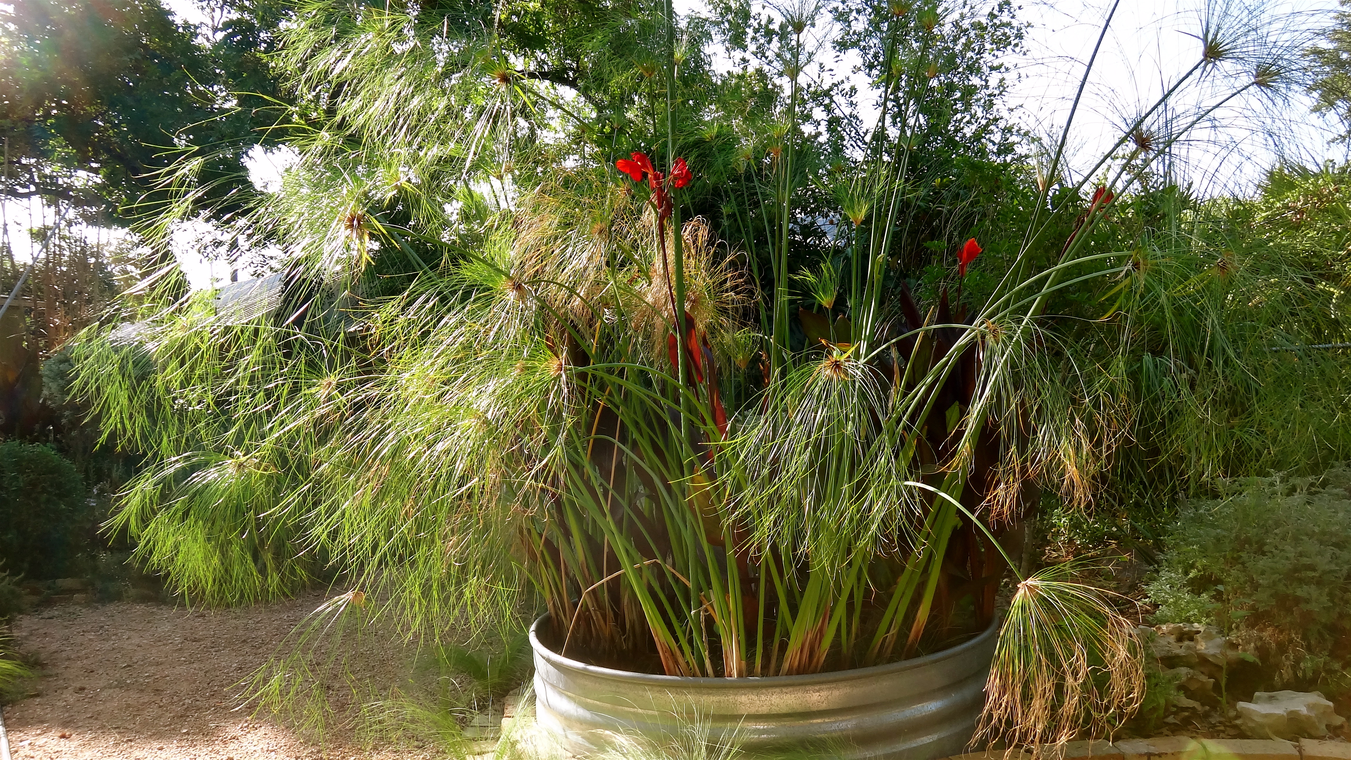 This stock tank planted up with King Tut papyrus and burgundy canna lilies is also relishing the baking heat,