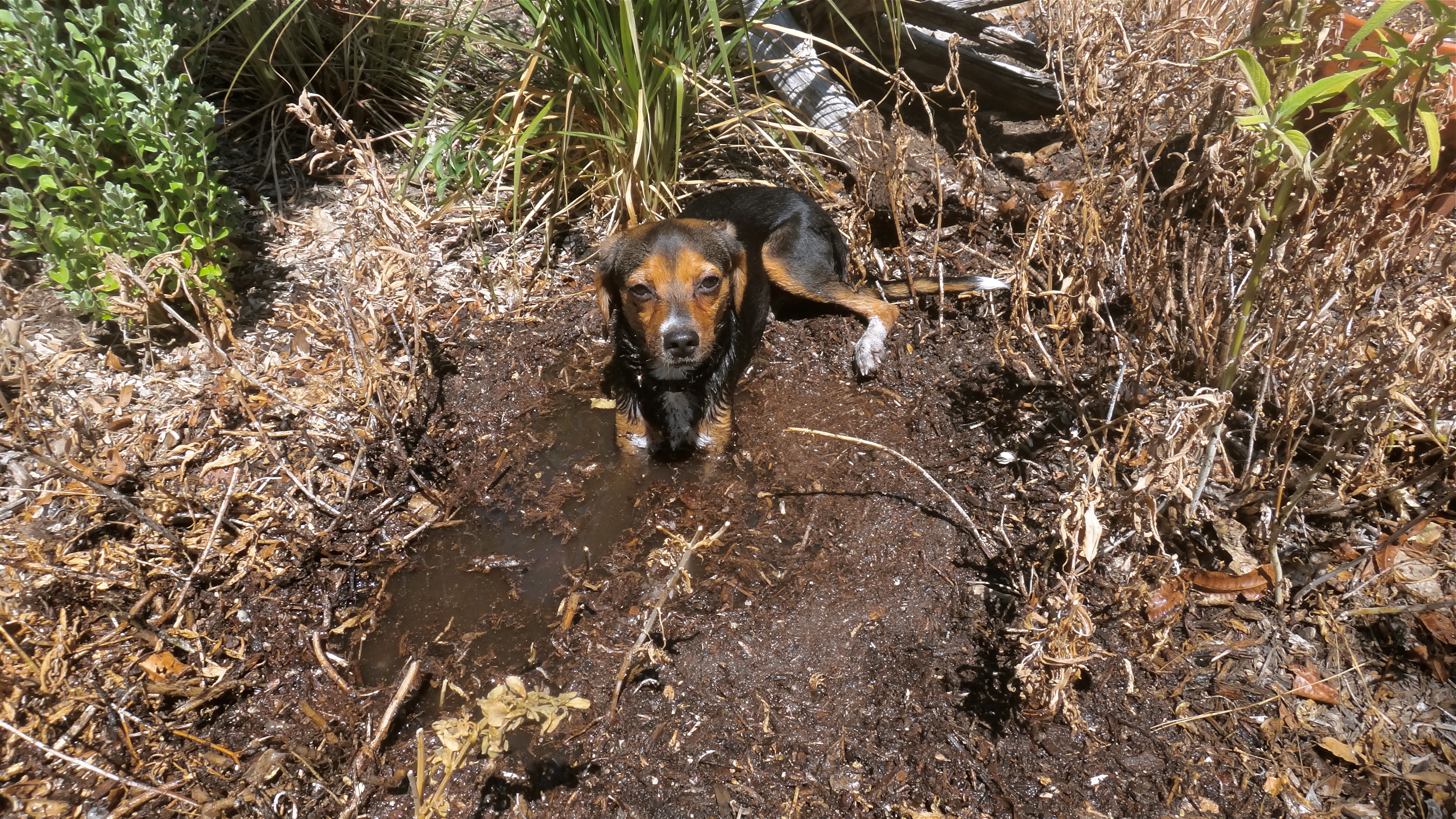 A slight forgetfulness on my part with the garden hose gave Kumo “the opportunist” the chance to a) cool off in a wallowing-pig like fashion and b) dig out what was left of my Salvia leucantha whilst yanking out some dead gaura with his teeth as a sort of cooling-off hobby, well it saved me the bother.