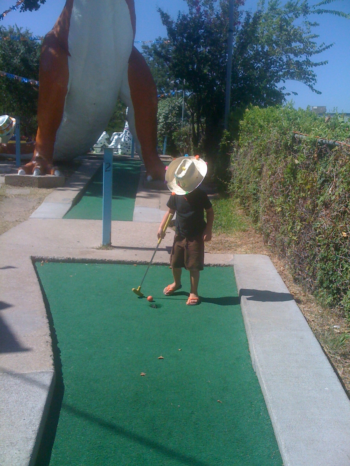 whilst he weathered the heat, brushed up on his short game and tried to ignore the rather large dinosaur looming behind him.