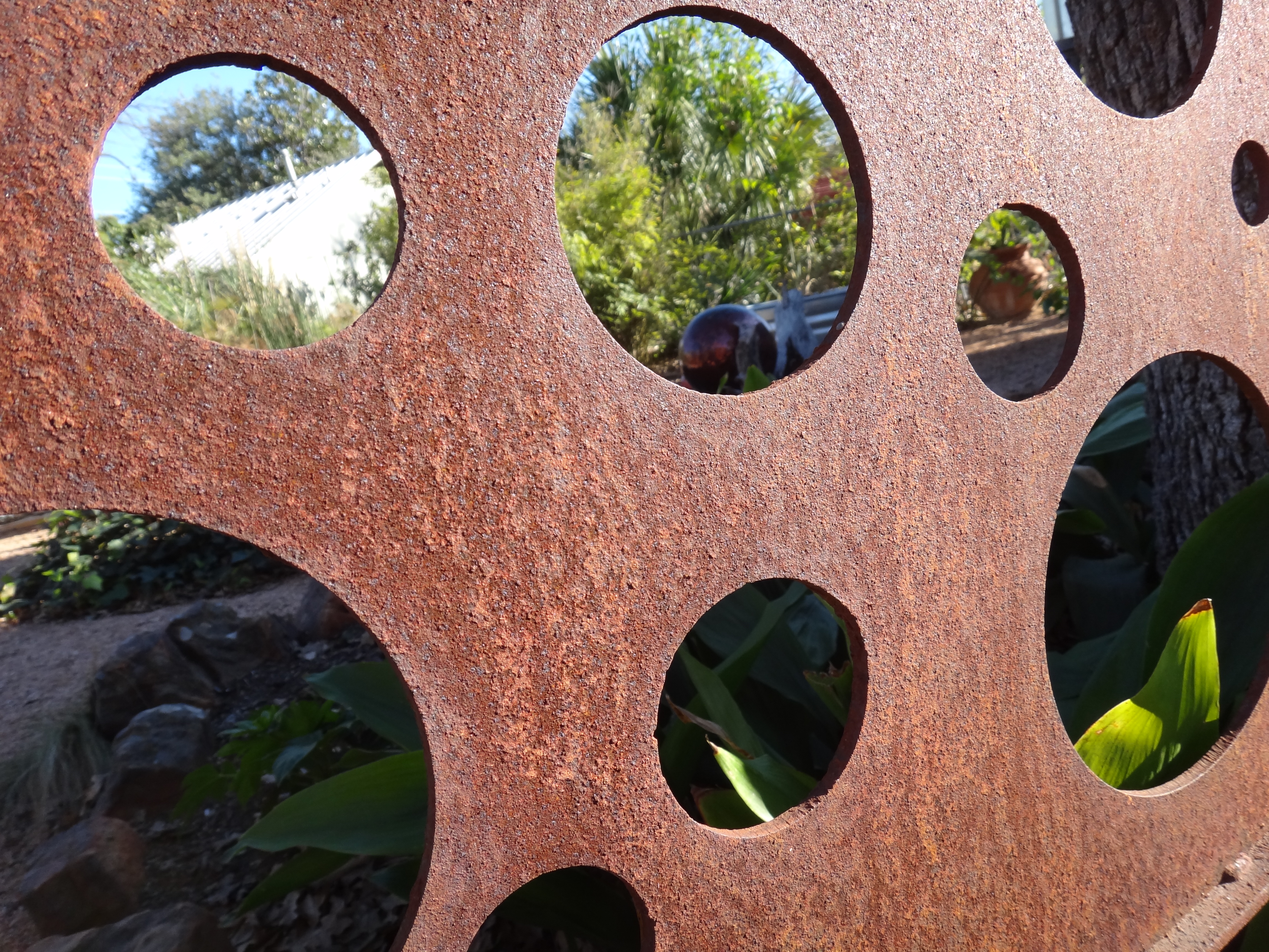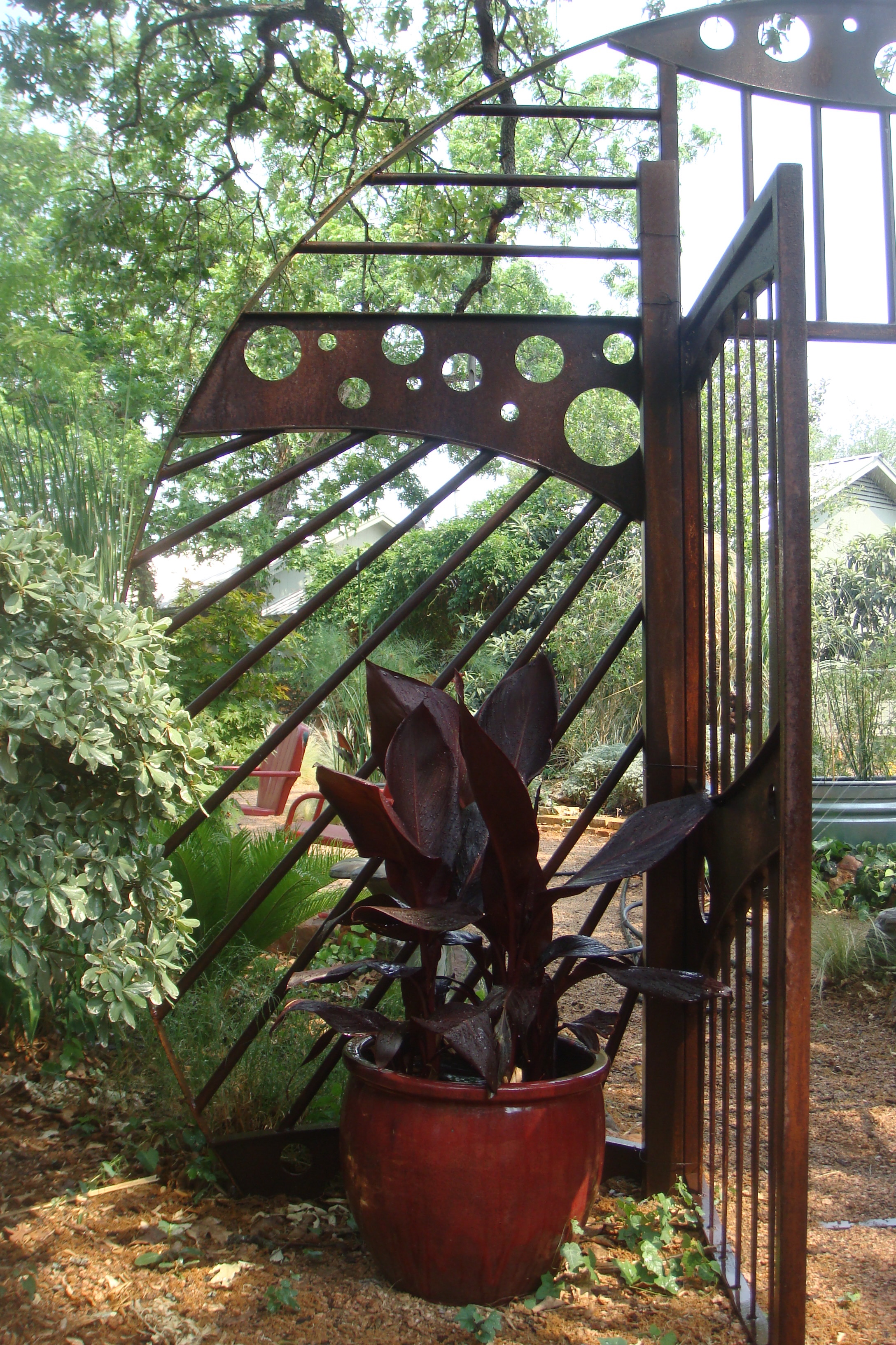 One has wasted no time climbing up the iron frame. These two plants will eventually cover and soften this arched gate,