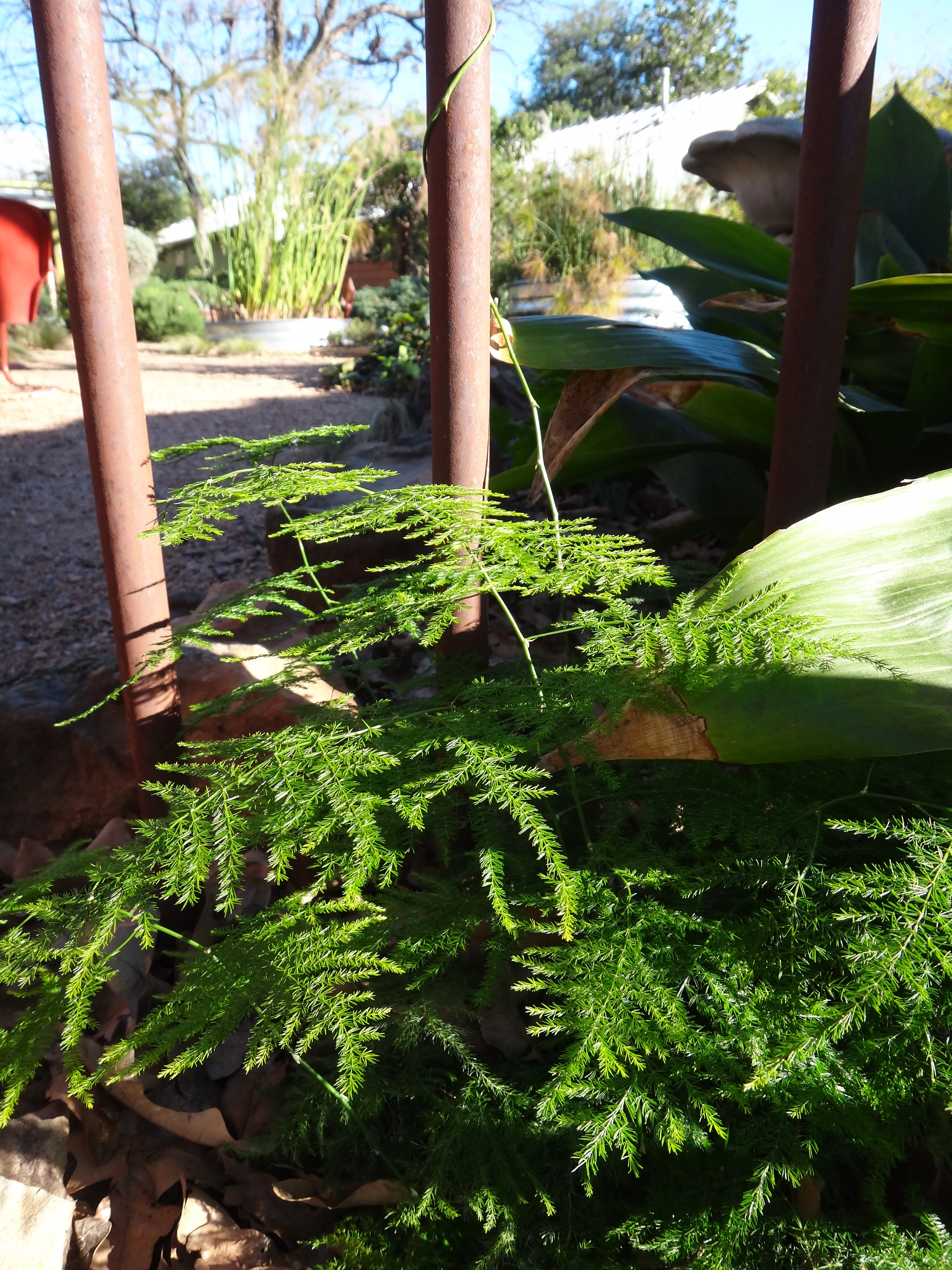 I checked on the two tiny plumosa ferns that I planted against my gate a few weeks back.