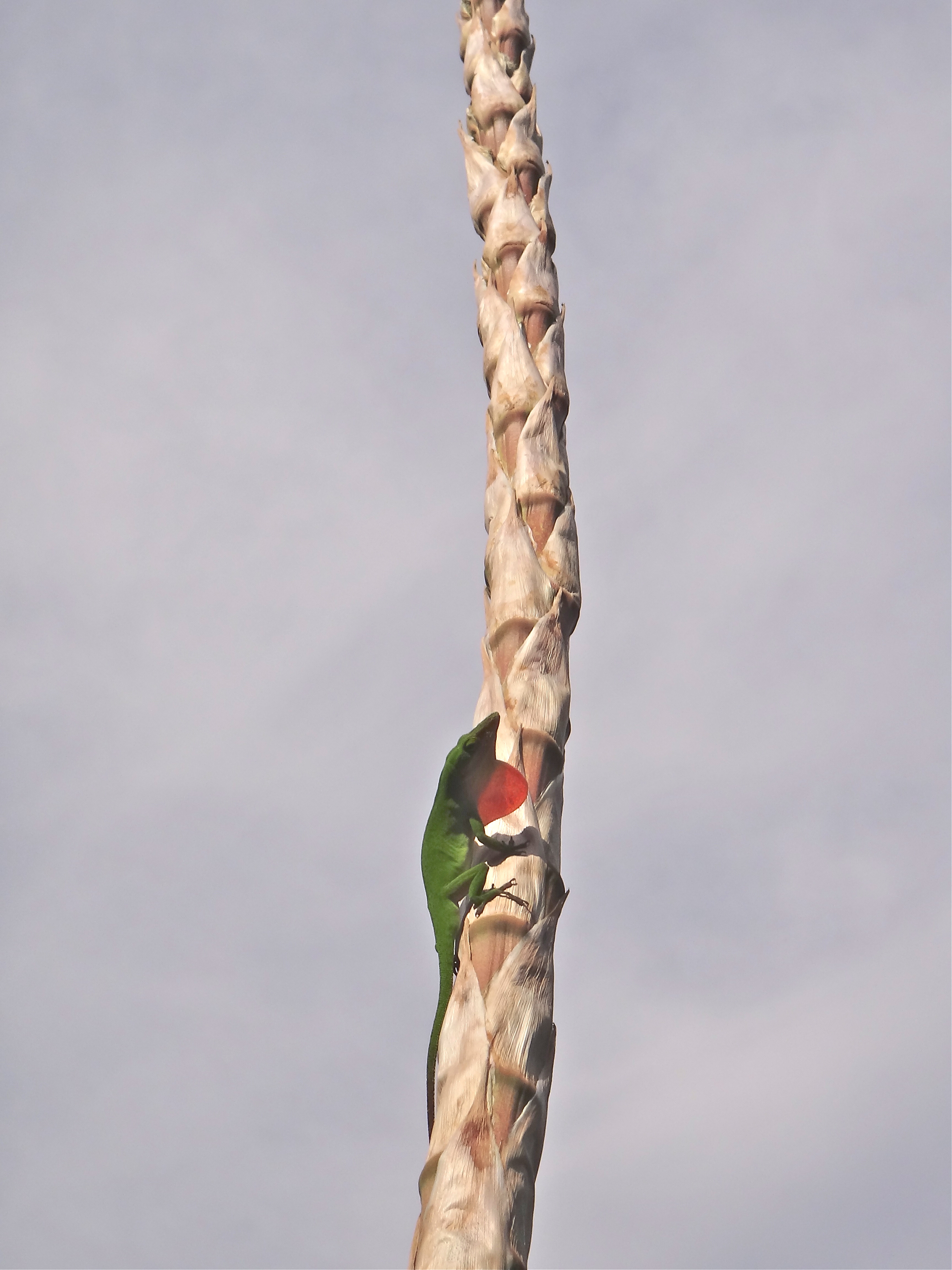 Stealing the golden egg and circumnavigating down the sotol stalk still proved to be a bit of a struggle for this anole though..