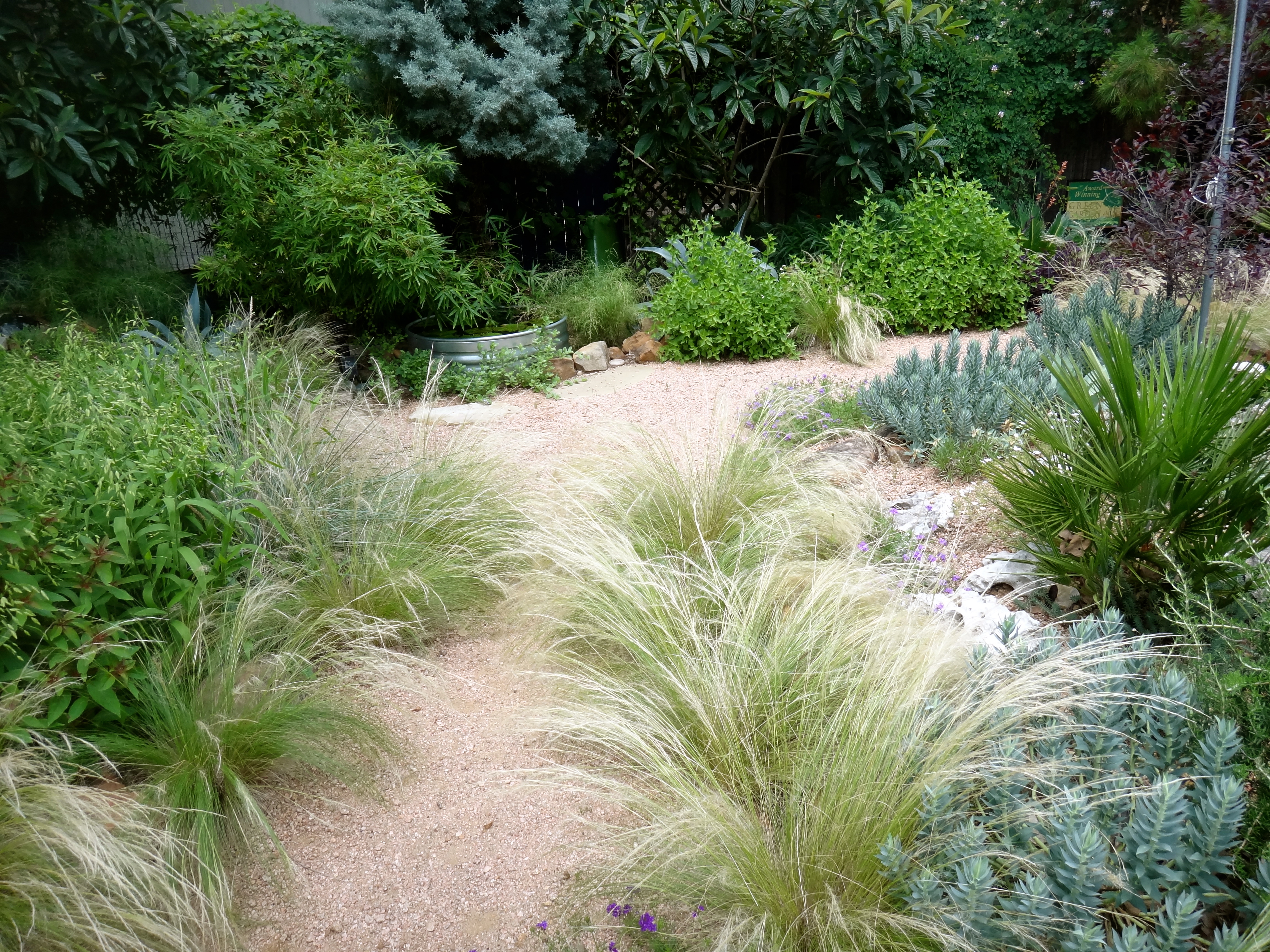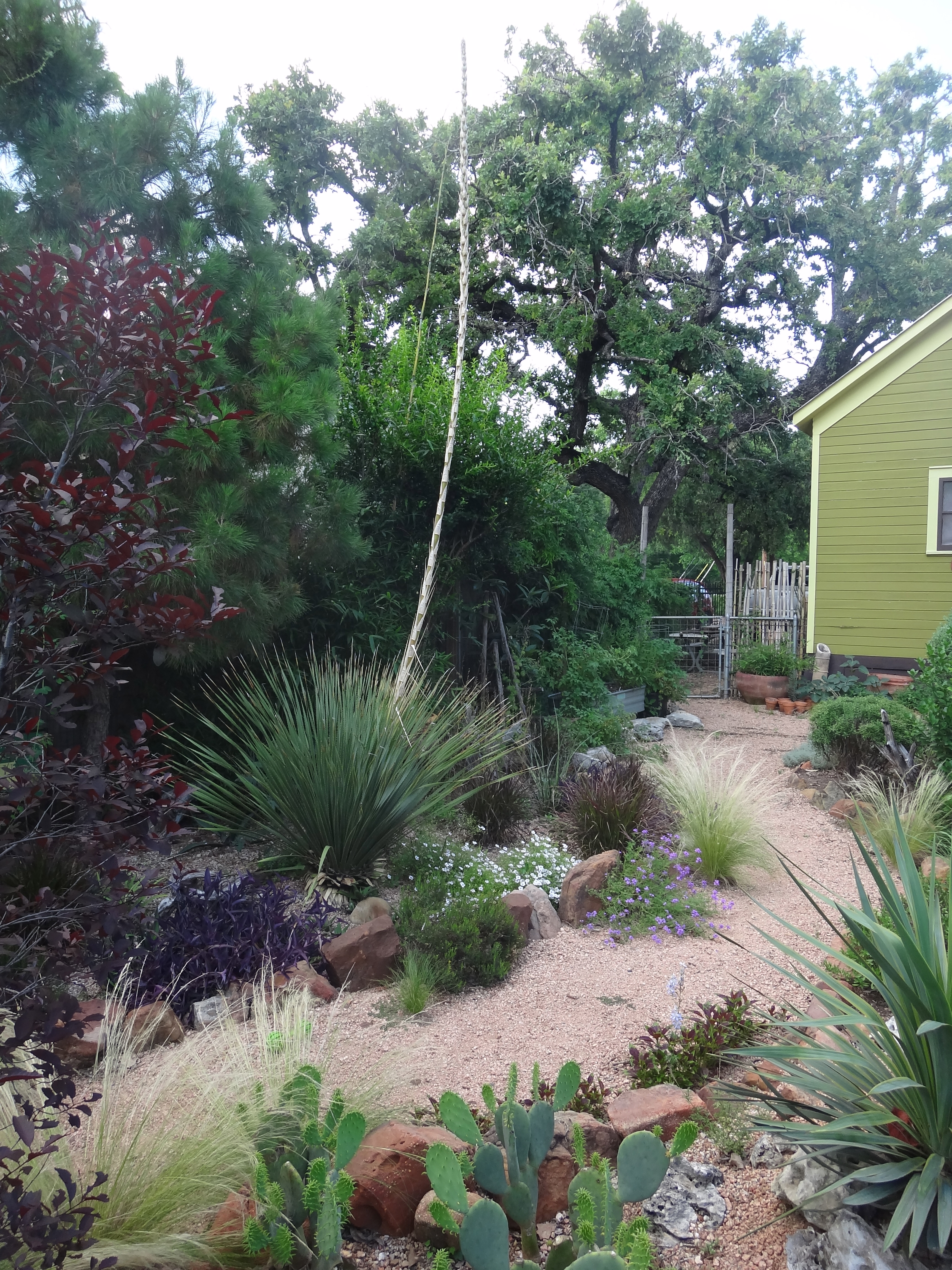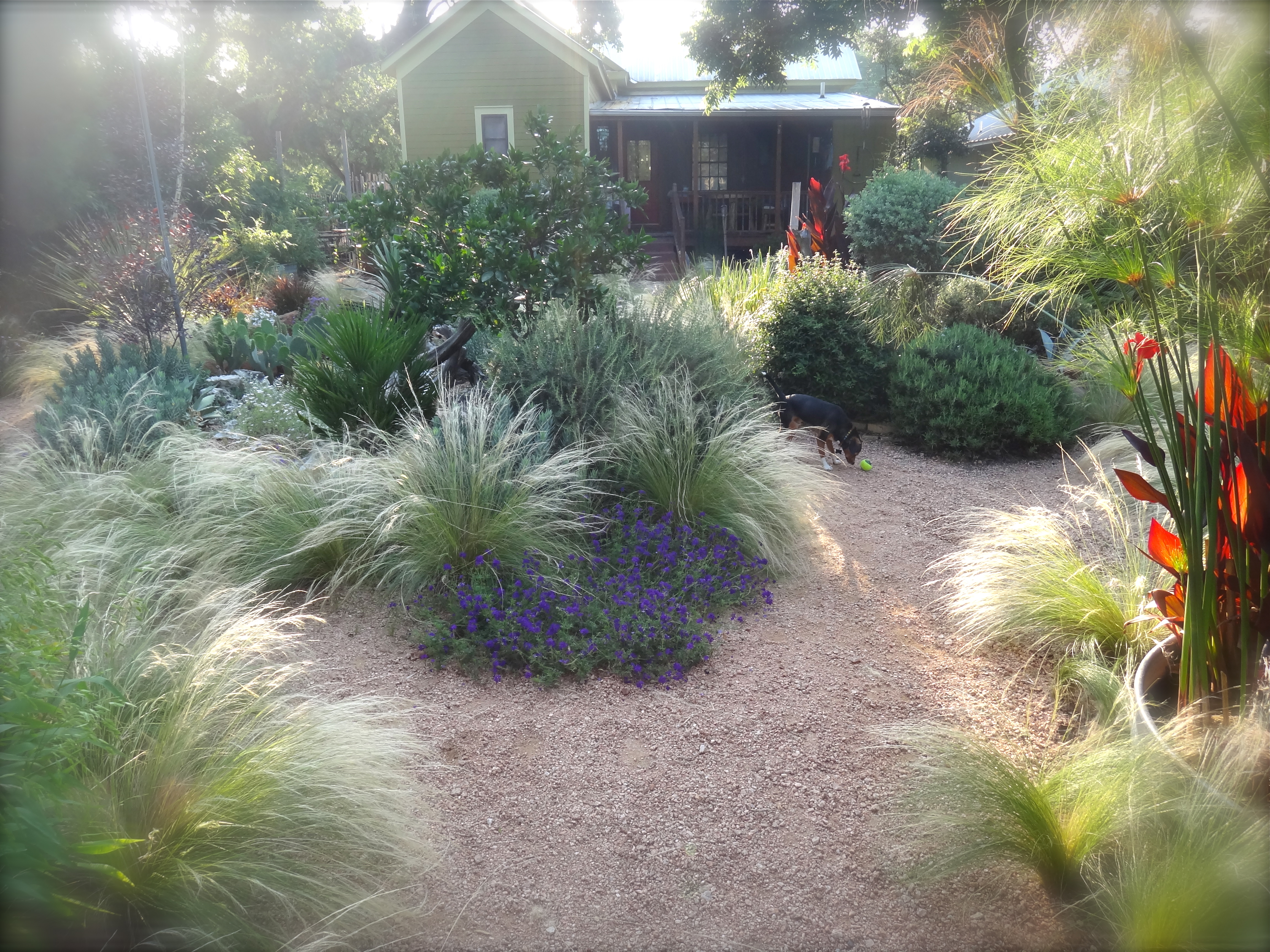 I pruned those two mist flowers (to the right of the stock tank) only a few weeks ago, they are already waist-high again. Feather grasses are almost ready for their bi-annual hair teasing, time to get out the cape once again: http://www.eastsidepatch.com/2010/05/knotty-dreads/