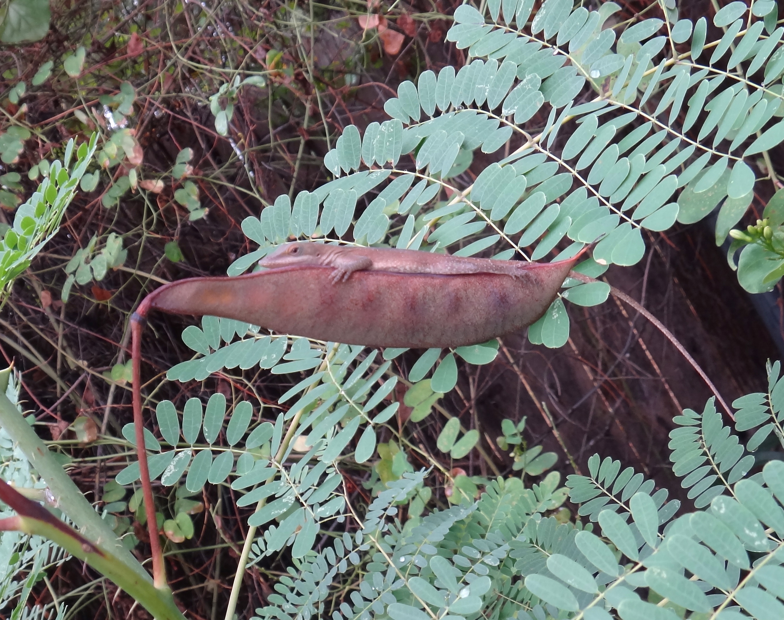 I caught this little camouflaged anole drying himself on a pride of Barbados seedpod.