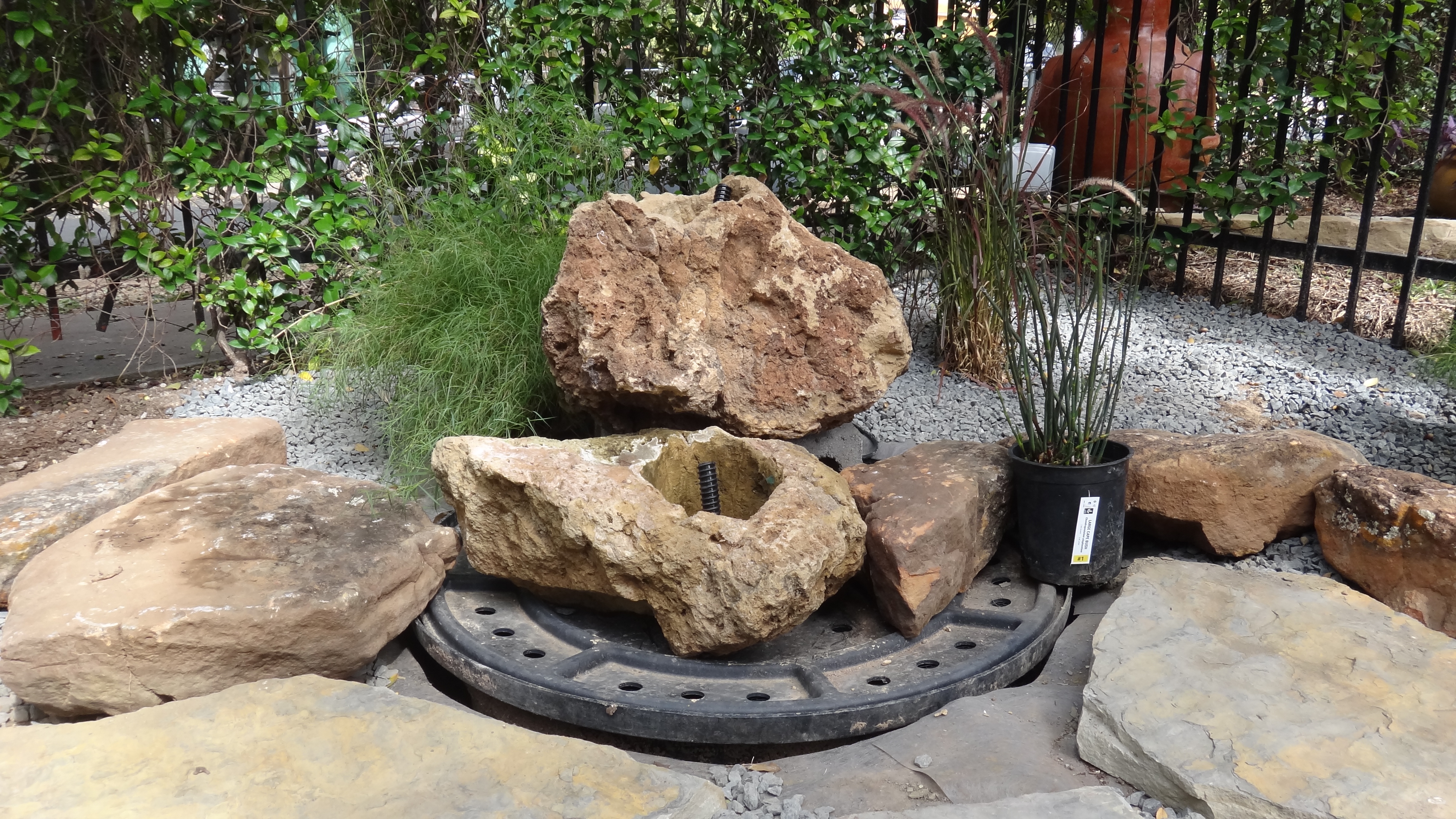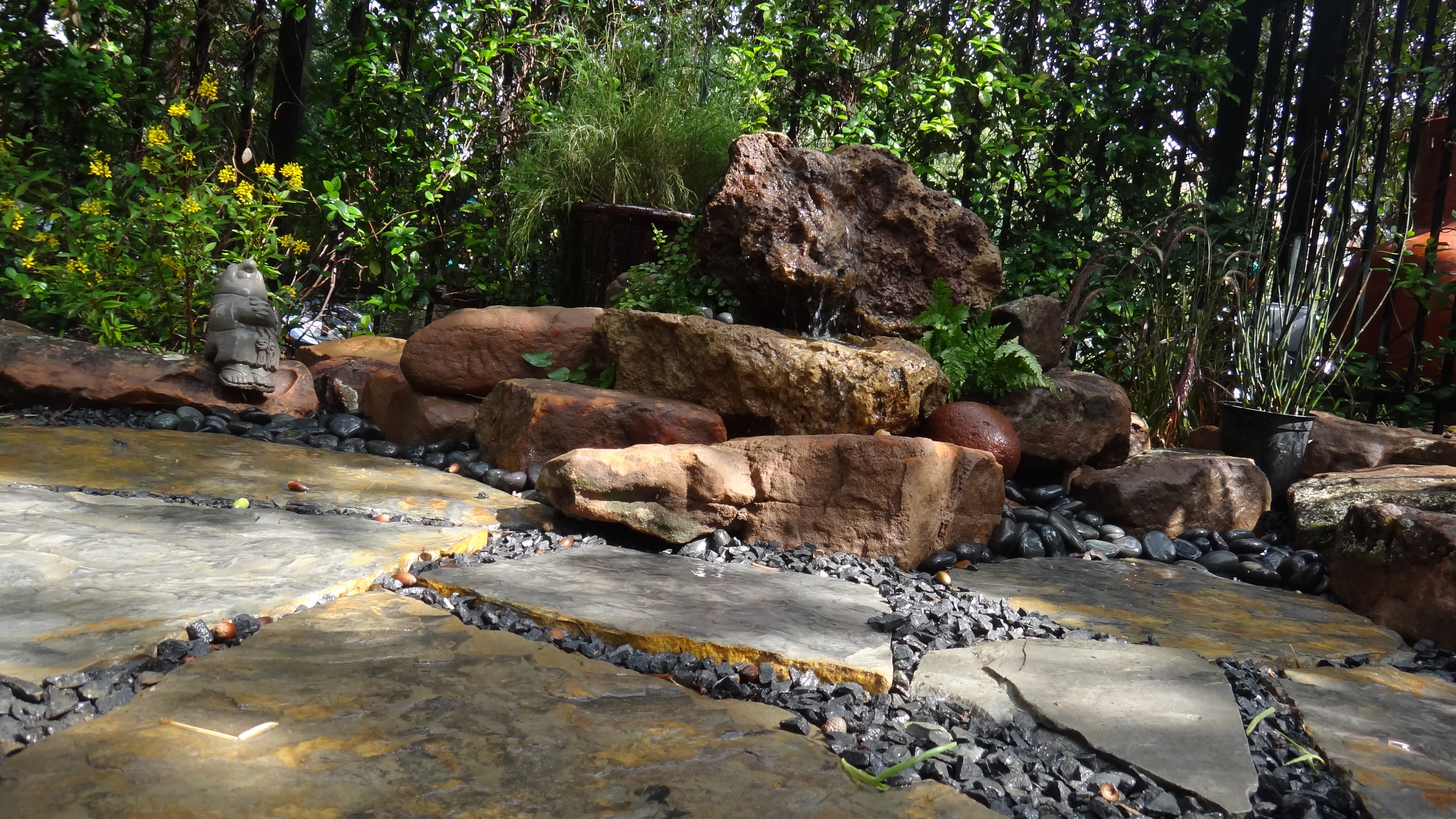 A naturalistic corner water feature was introduced as a focal point to a new patio, introducing the sound of running water to entice birds and nature.